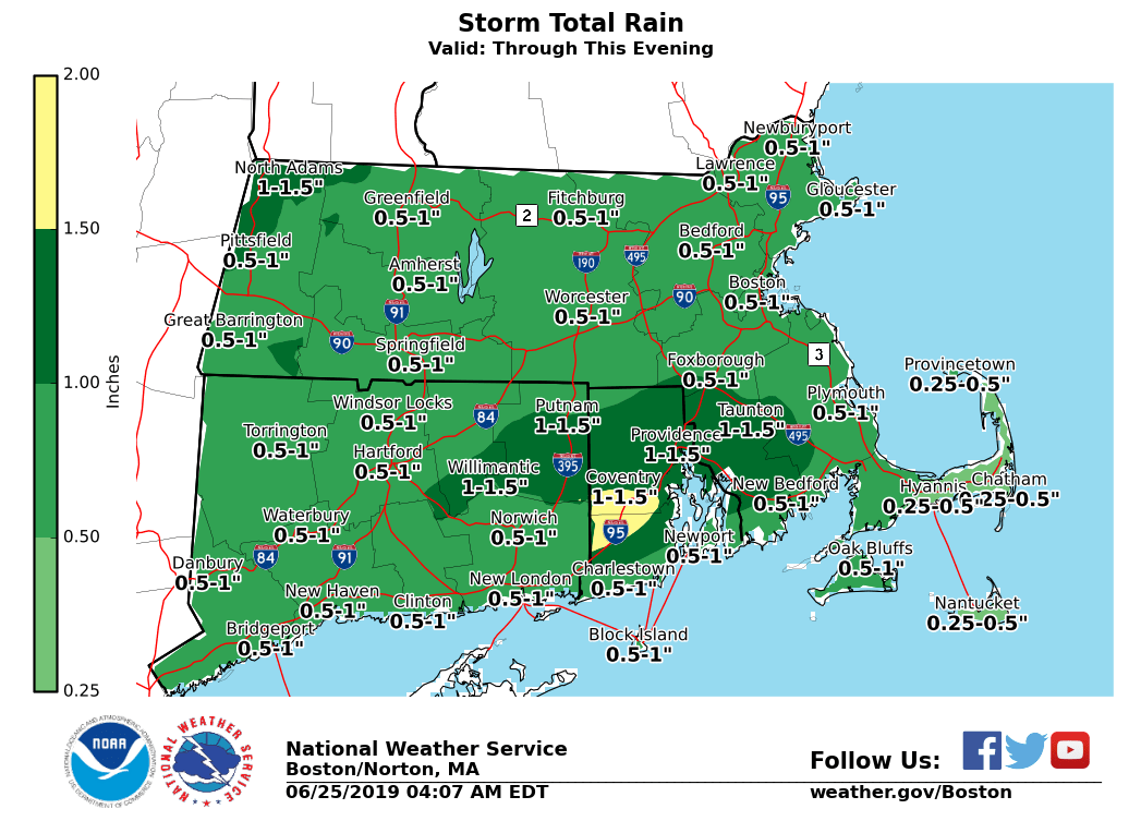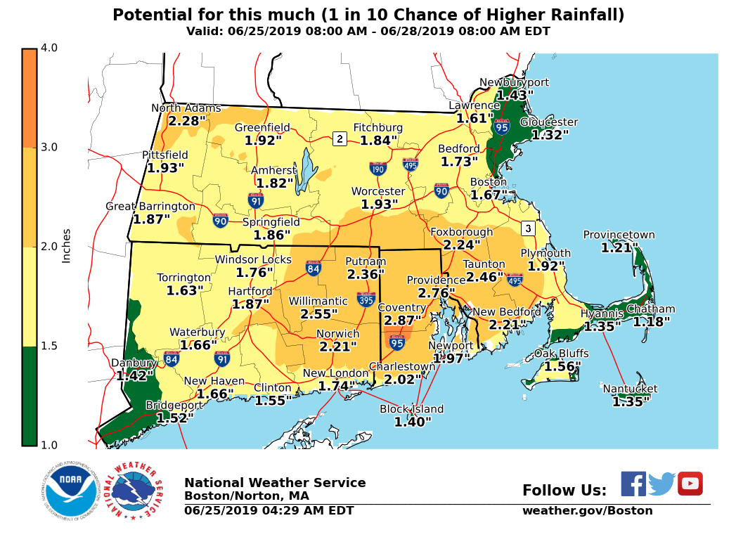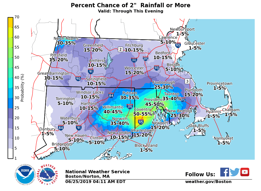 Good morning, We wanted to give everyone a heads up on the potential for locally heavy rainfall today which may lead to a risk of localized urban and poor drainage flooding. Details follow below. *What:* - Localized heavy rainfall with amounts of 2+ inches in a 6 hour period - Urban and poor drainage flooding possible if these amounts are realized *Where:* - The best chance will be south of the Mass Pike, particularly across eastern CT, RI and portions of southeast MA. *When:* - Mainly this afternoon into early evening - Heavy rainfall may impact the afternoon commute *Uncertainty:* - There is uncertainty with respect to where the axis of heavy rainfall will set up. The location may still shift to the north or south We have attached graphics showing our expected rainfall, worst case scenario rainfall, and the probability of greater than 2 inches of rainfall. As always, if you have any questions or concerns, please reach out to us any time. Kevin Cadima NWS Boston/Norton If you have any questions or would like more information, don't hesitate to contact us via this email address, on NWSChat <https://nwschat.weather.gov/>, or at the following: National Weather Service Boston/Norton, MA 46 Commerce Way Norton, MA 02766 508.622.3280 Website <http://www.weather.gov/boston> | Facebook <http://www.facebook.com/NWSBoston> | Twitter <http://www.twitter.com/NWSBoston>