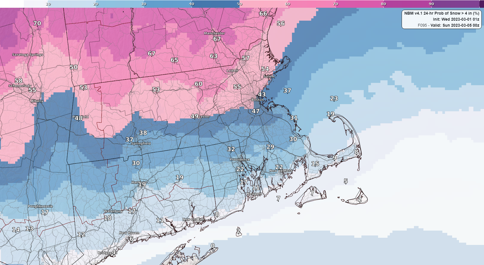 Good morning, We wanted to begin messaging for a potentially impactful winter storm that will impact the Northeast Friday afternoon into Saturday. Attached is a one page briefing with some details on where the forecast stands at this point in time. Confidence is growing that there will be at least minor impacts for the areas north of I-90. The attached graphic represents the percent chance of 24 hour snowfall exceeding 4 inches. We'll have more details over the next 24 hours as new data becomes available. Additionally, since we are sending this email we wanted to provide a heads up that there is also a chance for some spotty freezing rain showers tonight over the high terrain of The Worcester Hills and The Berkshires. Given the expected isolated/spotty nature of these showers, there is no winter weather advisory in effect for freezing rain. There will however be the potential for a few slick spots over these areas, but little to no impacts are expected. Thank you and have a great day, Robert Megnia and Matthew Belk If you have any questions or would like more information, don't hesitate to contact us via this email address, on NWSChat <https://nwschat.weather.gov/>, or at the following: National Weather Service Boston/Norton, MA 46 Commerce Way Norton, MA 02766 508.622.3280 Website <http://www.weather.gov/boston> | Facebook <http://www.facebook.com/NWSBoston> | Twitter <http://www.twitter.com/NWSBoston>