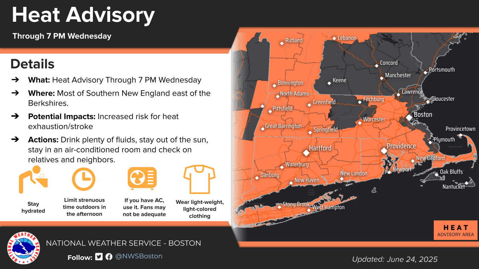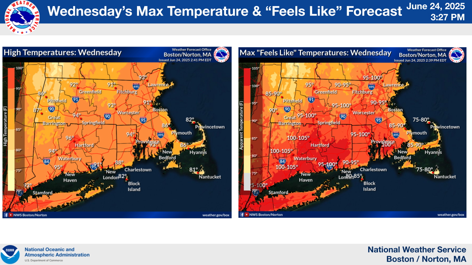 Good afternoon, all: A Heat Advisory has been posted for most of southern New England east of the Berkshires, except for northern Worcester County and the east coast of MA. This advisory is in effect through 7 PM Wednesday. Attached are two graphics. The first shows the extent of the Heat Advisory headlines currently in effect. Please note, this includes the Heat Advisory for the Berkshires through 8 PM Today. The other has maps of expected high and max "feels like" temperatures Wednesday. Matthew Belk If you have any questions or would like more information, please don't hesitate to contact us. You can reach us via: email: box.operations@noaa.gov phone: 508.622.3280 Slack/NWSChat 2.0 <https://nwschatws.slack.com/> (for approved partners) social media: Website <http://www.weather.gov/boston> | Facebook <http://www.facebook.com/NWSBoston> | Twitter <http://www.twitter.com/NWSBoston>