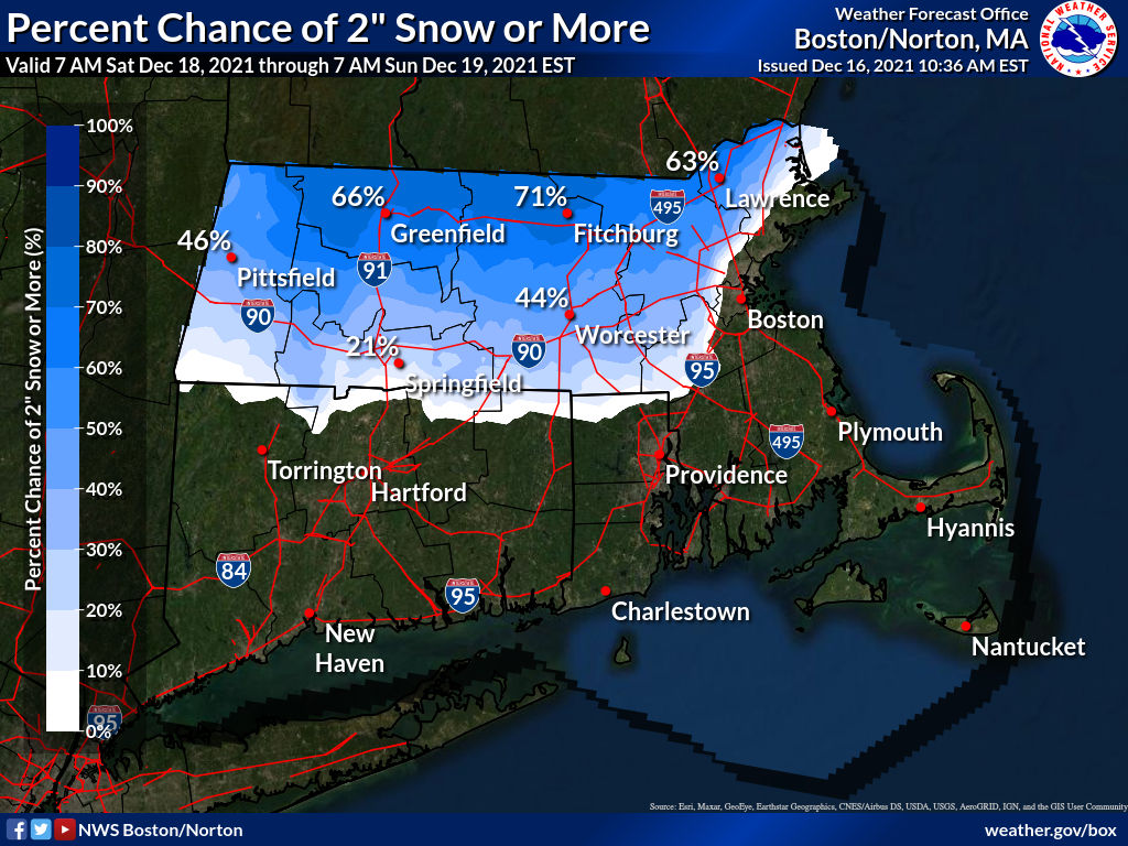 Good Afternoon Everyone, Attached is the latest briefing on the potential for wintry weather Saturday and Saturday night. We are becoming more confident that this will be a minor event with mostly travel impacts. The current expectation is that Winter Weather Advisories could be issued sometime tomorrow. Since there is uncertainty as to how quickly the transition from snow to a wintry mix and eventually rain will occur, which will affect snowfall totals, we attached a map showing the probability of 2 inches or more of snow. Note that it is highest near the Vermont/New Hampshire border where we think as much as 4 inches of snow is possible. Also keep in mind much of the interior could see a light coating of ice during the transition (less than 0.10"). Our Winter Weather page <https://www.weather.gov/box/winter> contains the latest snow and ice forecasts, including probabilistic information. If you have any questions or would like more information, don't hesitate to contact us via this email address, on NWSChat <https://nwschat.weather.gov/>, or at the following: Thanks, Joe DelliCarpini and Andrew Loconto National Weather Service Boston/Norton, MA 46 Commerce Way Norton, MA 02766 508.622.3280 Website <http://www.weather.gov/boston> | Facebook <http://www.facebook.com/NWSBoston> | Twitter <http://www.twitter.com/NWSBoston>
