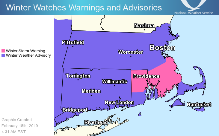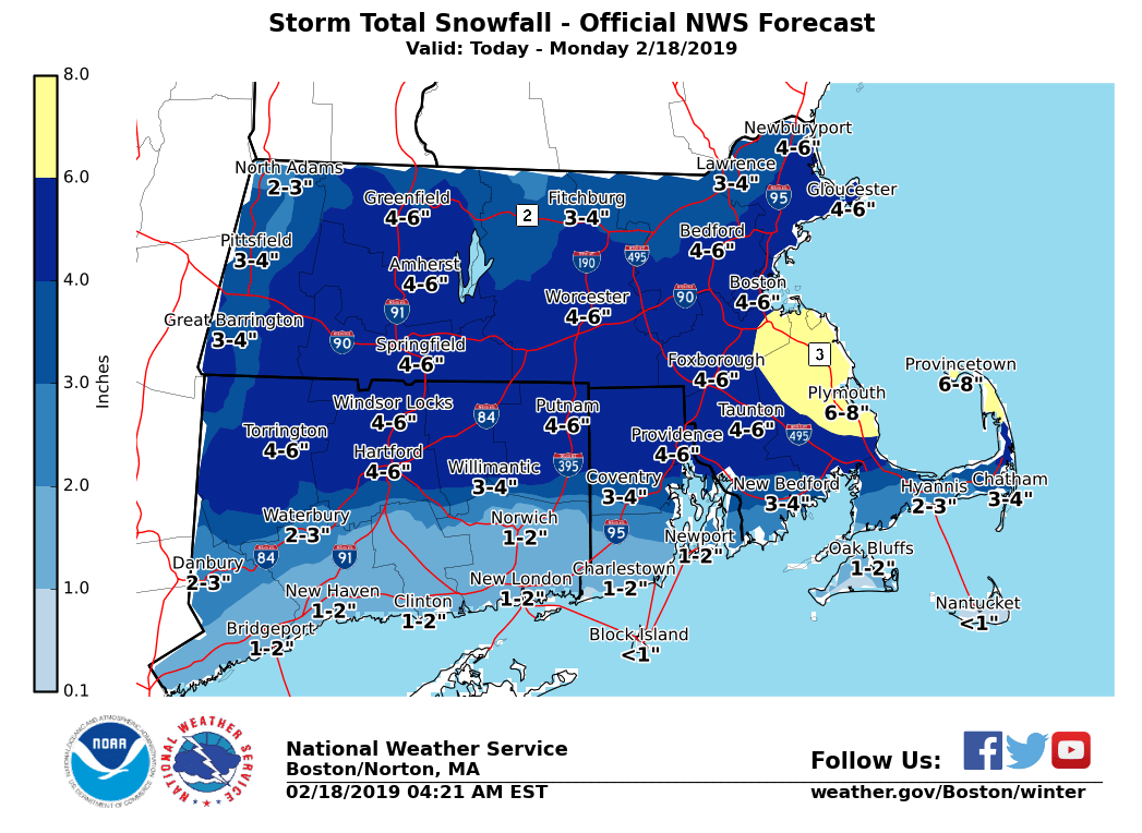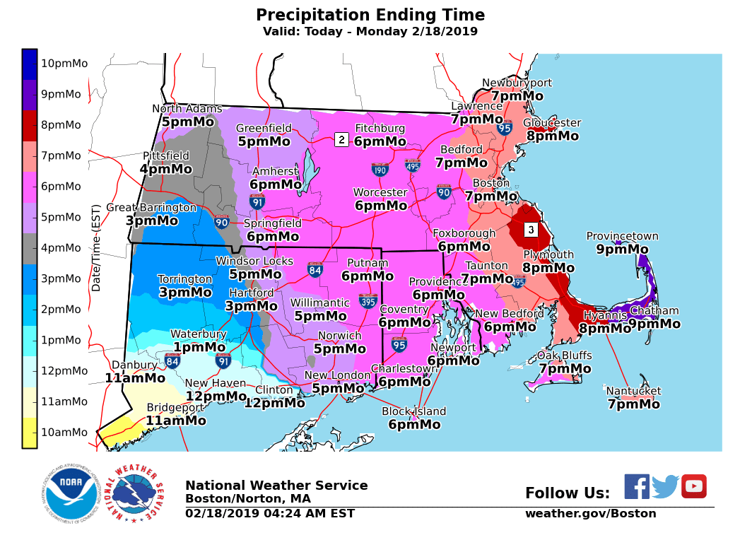 Good morning everyone, *What has changed:* - No changes to headlines (Warnings & Advisories) - Snow amounts adjusted slightly downward along the south coast of MA/RI and also across northern MA *WHAT: * - A plow-able snowfall *WHERE: * - All of Massachusetts, Rhode Island and Connecticut *WHEN: * - The steadiest and heaviest snow along with low visibility early this morning will begin to transition to a lighter snow between 6 am to 8 am from west to east - Lighter snows will continue later this morning and afternoon. Visibility will improve from earlier this morning along with hourly snowfall rates decreasing. *POTENTIAL IMPACTS:* - Snow covered roads along with reduced visibility will result in poor driving conditions (although a lighter morning commute given the holiday will help) particularly along and south of the MA turnpike into CT and RI . - Given the lighter snowfall rates later this morning and into the afternoon along with increasing visibility will result in improving driving conditions *UNCERTAINTY:* - Mixed wintry precipitation along the south coast this morning may drift northward into the Greater Providence to Plymouth corridor. This may hold down snow accumulations in this area - Low risk of patchy freezing drizzle southern RI/MA later this morning and afternoon - Confident that snow intensity will decrease between 6 am and 8 am from west to east this morning followed by lighter and more intermittent snow later this morning and afternoon - there is a low risk for a few moderate snow bands this afternoon that could briefly lower visibility along with roads becoming snow covered again. Attached is a graphic highlighting Winter Weather Advisories and Winter Storm Warnings along with Storm Total Snow graphic and a timeline of when snow will end later today. Please let us know if you have any questions or concerns. Thank You Meteorologists: Frank Nocera & Matt Doody If you have any questions or would like more information, don't hesitate to contact us via this email address, on NWSChat <https://nwschat.weather.gov/>, or at the following: National Weather Service Boston/Norton, MA 46 Commerce Way Norton, MA 02766 508.622.3280 Website <http://www.weather.gov/boston> | Facebook <http://www.facebook.com/NWSBoston> | Twitter <http://www.twitter.com/NWSBoston>