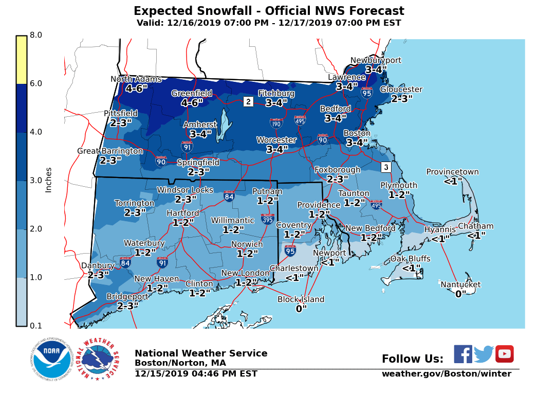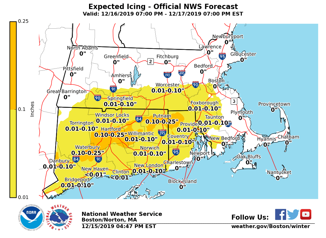 Good evening, Winds will be gradually diminishing tonight. Wind Advisories will expire between 7 PM and 9 PM this evening and Gale Warnings will be lowered before daybreak. Attention will then turn to the next winter weather event, which will be arriving Monday night and continuing on Tuesday. *Accumulating Snow to Wintry Mix: Monday Night and Tuesday* We now have high confidence in a period of wintry weather for Monday night and Tuesday. We are expecting snow to develop across the entire region, except for a mix of rain, sleet and snow along the immediate south coast Monday evening between 8 PM and 11 PM. The snow is forecast to change to sleet and freezing rain over interior sections mainly south of the Mass Pike overnight. A band of moderate to heavy snow could develop from Springfield to Worcester, northward to the NH border, mainly between 4 AM and 10 AM Tuesday morning. Thus, the Tuesday morning commute does look like it will be adversely impacted by a mix of wintry weather, ranging from snow to ice. The Boston area southward to the Cape/Islands, as well as most of RI, will likely be all rain by early Tuesday morning. Current snowfall and ice accumulation maps are attached. We are forecasting 1 to 3 inches of snow/sleet south of the Mass Pike with 3 to 5 inches of mainly snow north of the Pike, with 6 inches possible near the NH border. Freezing rain of up to one-tenth inch is expected in RI, northern CT, and interior MA south of the Mass Pike, but a few spots of 0.10 to 0.25 inches of ice are possible, especially in northern CT and northern RI. *Confidence:* Remains moderate to high on wintry weather impacting the Tuesday morning commute. Changeovers for precipitation type and timing remain uncertain which may alter the overall snow and/or ice accumulations. There is the potential for steadier bands of snow that may produce snow rates at or an inch per hour or a bit higher into early Tuesday morning, especially north of the Mass Pike. *Arctic Blast Wednesday night and Thursday* A major Arctic cold front will blast through the region Wednesday evening, accompanied by brief wind gusts that could reach Wind Advisory criteria (40 to 50 mph), possible snow squalls, and then frigid temperatures. Lows will range from 0 far northwest MA to the teens in southeast MA and southern RI. Wind Chill Advisories may be needed for western and central MA, where wind chills of -10 to -20 degrees are forecast. Gales are quite likely over the coastal waters. Highs on Thursday will only reach 15 to 25 degrees, with wind chill indices still hovering from -5 to 10 above during the day. -- Glenn Field Warning Coordination Meteorologist NWS - Boston/Norton, MA If you have any questions or would like more information, don't hesitate to contact us via this email address, on NWSChat <https://nwschat.weather.gov/>, or at the following: National Weather Service Boston/Norton, MA 46 Commerce Way Norton, MA 02766 508.622.3280 Website <http://www.weather.gov/boston> | Facebook <http://www.facebook.com/NWSBoston> | Twitter