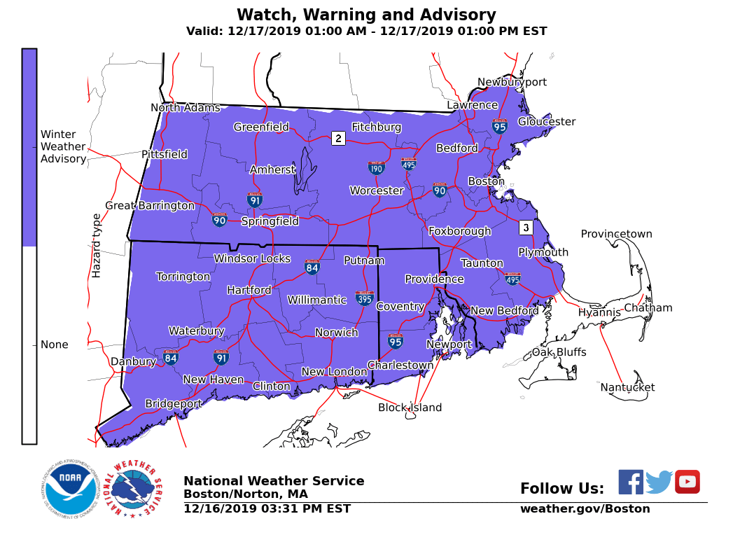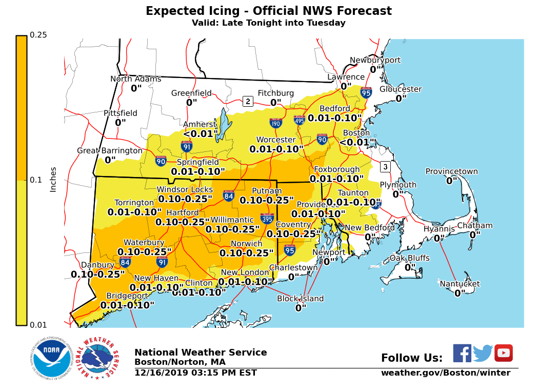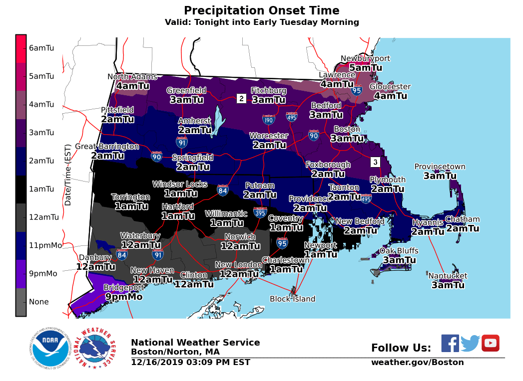 Good afternoon, *Changed*: Increased snowfall amount by 0.5 to 1 inch south of the MA turnpike. Moved the freezing rain coverage northwards to include parts of Worcester and Middlesex county. We are still expecting a winter storm to impact the region on Tuesday. Not a major snow/ice event but timing is problematic. Precipitation will start off as snow around 3 to 4am on Tuesday across Northern CT and RI, spreading northward through mid morning. Snow is expected to mix with or change over to sleet/freezing rain and then rain south of the MA turnpike. Wintry mix changes back to light snow from northwest to southeast Tuesday afternoon before taping off late Tuesday night. After that, there is a potential for snow squalls on Wednesday afternoon/early evening with the passage of an Arctic front, possibly impacting the evening commute but confidence is low on the extent and intensity. Lastly, the combination of NW gales and the arctic air mass could result in light freezing spray near shore Wednesday night into early Thursday morning. *Accumulating snow and light to moderate ice accretion:* *Locations*: All locations. *Timin*g: Tomorrow early morning into late evening. *Amounts*: 1 to 3 inches of snow/sleet with a few hundredths of an inch of freezing rain south of the MA turnpike. Up to two tenths of an inch of freezing rain is possible across northern CT and RI. 3 to 5 inches of snow/sleet north of the MA turnpike with up to 6 inches possible in far Western Franklin and Hampshire county. *Impact*: Snow accumulations of up to 1 inch per hour resulting in poor visibility and icy roads making for hazardous morning commute. *Confidence*: Moderate to high. It remains to be seen when the exact timing of the changeover to sleet/freezing rain will occur. Highest confidence for higher ice accretion in Northern CT. *Potential snow squalls:* *Locations*: All locations. *Timing*: Wednesday afternoon into early evening. *Amounts*: A quick coating to half an inch in less than 30 minutes. *Impact*: Temporarily reduced visibility could catch drivers off guard, especially for early evening commute. Also, roads could become snow-covered quickly, resulting in slippery travel. *Confidence*: Low to moderate. It remains to be seen if snow squalls could hold together into Eastern MA and RI and their intensity. *Dangerous wind chills:* *Locations*: All locations. *Timing*: Wednesday night into Thursday morning. *Amounts*: Wind chill values -5 to -20°F in the interior and +5 to -10°F in Eastern MA and RI. *Impact*: Coldest air of the season. Frigid wind chills for school bus stop. *Confidence*: High. *Potential risk of freezing spray:* *Locations*: Immediate coastal waters off Eastern MA and RI. *Timing*: Wednesday night into early Thursday morning. *Amounts*: Light freezing spray possible. *Impact*: Glaze of ice possible on boats and ships traversing the waters. *Confidence*: Low. Please see the attached graphics for the hazards, snow onset timing, snowfall total, ice total and minimum apparent temperature for Thursday morning. If you have any questions or would like more information, don't hesitate to contact us via this email address, on NWSChat <https://nwschat.weather.gov/>, or at the following: Meteorologist: Rodney Chai and Frank Nocera National Weather Service Boston/Norton, MA 46 Commerce Way Norton, MA 02766 508.622.3280 Website <http://www.weather.gov/boston> | Facebook <http://www.facebook.com/NWSBoston> | Twitter <http://www.twitter.com/NWSBoston>