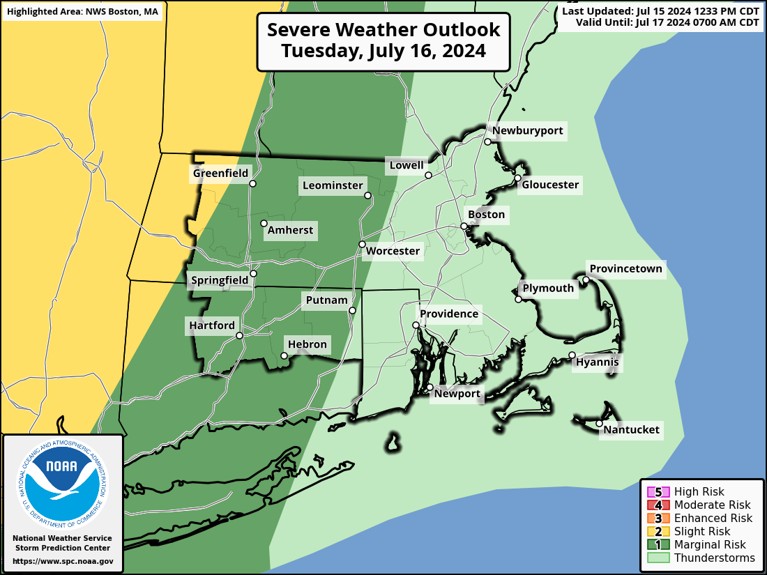 Good afternoon, No real changes to the expected heat index values Tuesday and Wednesday did extend the Heat Advisory to more of MA Wednesday. Relief from the heat and humidity is still on track for Thursday, Friday and Saturday, with a return to seasonable temperatures and much more comfortable humidity. We included the graphic of the Heat Advisory as well as the expected Heat Indices Tuesday and Wednesday. We also should mention there is the risk for mainly afternoon and evening scattered showers and thunderstorms Tuesday. The activity may be more widespread later Wednesday into Wednesday night as a cold front crosses the region. There also is the potential for scattered strong to severe thunderstorms during the afternoon and evening of both Tuesday and Wednesday. Matthew Belk If you have any questions or would like more information, please don't hesitate to contact us. You can reach us via: email: box.operations@noaa.gov phone: 508.622.3280 Slack/NWSChat 2.0 <https://nwschatws.slack.com/> (for approved partners) social media: Website <http://www.weather.gov/boston> | Facebook <http://www.facebook.com/NWSBoston> | Twitter <http://www.twitter.com/NWSBoston>