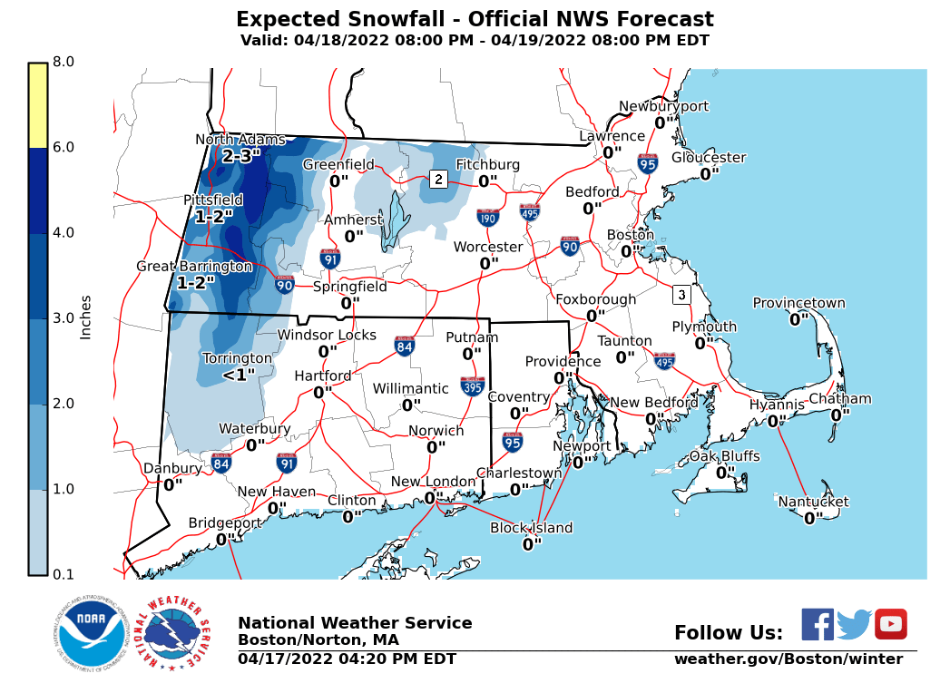 Good afternoon, Attached is an initial briefing and supporting graphics regarding a storm system expected to bring strong to damaging winds, splashover to minor coastal flooding, accumulating snow in the Berkshires, and a period of heavy rain Monday night into Tuesday morning. A *High Wind Watch *is in effect for Barnstable, Dukes and Nantucket Counties in MA from late Monday night into Tuesday morning. The storm's eventual track is still uncertain, and further adjustments to the snow forecast are still possible depending on the track. Regarding coastal flooding: east-southeast wind on Tuesday morning's high tide (1:26 AM) would favor Boston Harbor and the North Shore as the areas most at risk. A 2 ft storm surge is currently expected after this high tide, supporting minor splashover or minor coastal flooding. A greater coastal flooding risk is possible if the peak surge occurs closer to the time of high tide (e.g. sooner than currently anticipated). Supporting graphics attached include: a map of active headlines, expected peak wind gusts, and forecast storm total rain and snow accumulations. Expect the next update to this briefing by 6 AM Monday. Thank You! Meteorologists: Andrew Loconto and Kevin Cadima If you have any questions or would like more information, don't hesitate to contact us via this email address, on NWSChat <https://nwschat.weather.gov/>, or at the following: National Weather Service Boston/Norton, MA 46 Commerce Way Norton, MA 02766 508.622.3280 Website <http://www.weather.gov/boston> | Facebook <http://www.facebook.com/NWSBoston> | Twitter <http://www.twitter.com/NWSBoston>