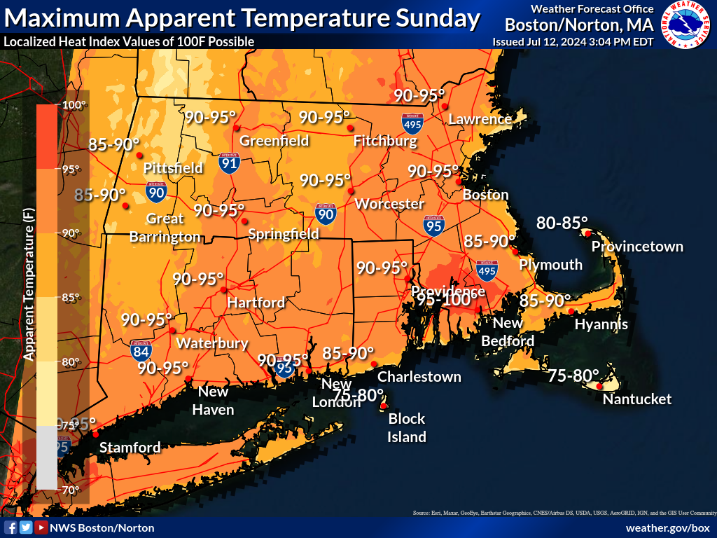 Good afternoon everyone, The forecast for the weekend into next week remains on track with little change since this morning's update. We continue to expect storms which may lead to localized flooding issues overnight into Saturday and increasing heat concerns starting Sunday. The hottest and most humid days will be Monday and Tuesday, potentially extending into Wednesday. If you have any questions please let us know. Thank you, Bryce Williams and Kyle Pederson If you have any questions or would like more information, please don't hesitate to contact us. You can reach us via: email: box.operations@noaa.gov phone: 508.622.3280 Slack/NWSChat 2.0 <https://nwschatws.slack.com/> (for approved partners) social media: Website <http://www.weather.gov/boston> | Facebook <http://www.facebook.com/NWSBoston> | Twitter <http://www.twitter.com/NWSBoston>