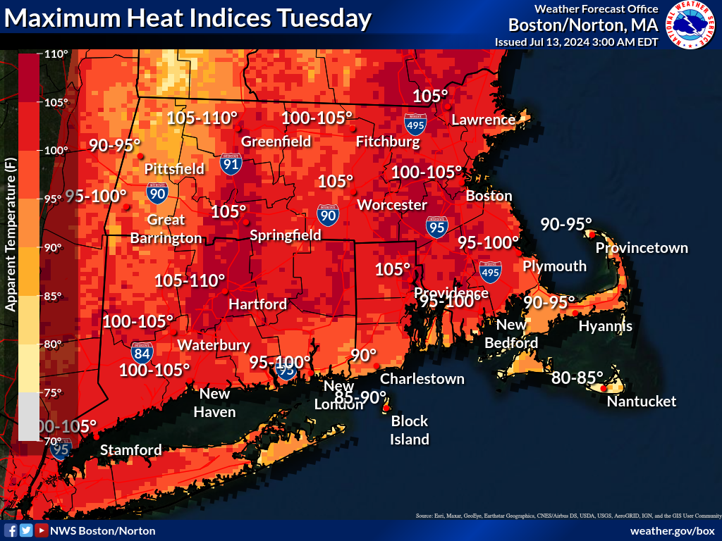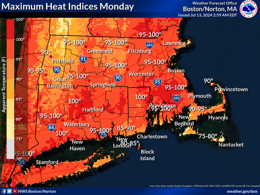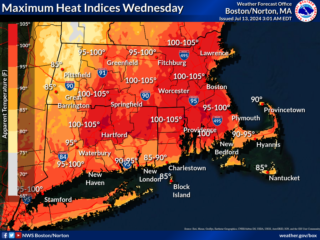 Good morning everyone A Flood Watch remains in effect today for most of southern New England...excluding the Cape and Islands. Showers and a few thunderstorms will bring the risk for localized flooding. The greatest risk for this appears to be south of the MA Turnpike...where localized areas may see 1 to 2 inches of rain within an hour. While any flooding will be localized...the greatest risk exists if these heavier bands occur over any vulnerable urban center. Otherwise...the main concern shifts to the return of Dangerous Heat and Humidity for the first half of next week. The heat will begin to return on Sunday, but the greater concern will be in the Monday through Wednesday time frame when the humidity arrives too. This is when afternoon Heat Indices of 95 to 105 degrees are expected...with Tuesday and Wednesday expected to be the worst of the heat and humidity. A cold front will bring relief from the Heat and Humidity by Thursday and Friday. Attached is a brief one-pager detailing the localized flood threat today, followed by the Dangerous Heat and Humidity during the first half of the upcoming week. We have attached the expected Heat Indices for Sunday, Monday, Tuesday and Wednesday. Please let us know if you have any questions or concerns! Thank You! Meteorologists: Hayden Frank and Robert Megnia If you have any questions or would like more information, please don't hesitate to contact us. You can reach us via: email: box.operations@noaa.gov phone: 508.622.3280 Slack/NWSChat 2.0 <https://nwschatws.slack.com/> (for approved partners) social media: Website <http://www.weather.gov/boston> | Facebook <http://www.facebook.com/NWSBoston> | Twitter <http://www.twitter.com/NWSBoston>