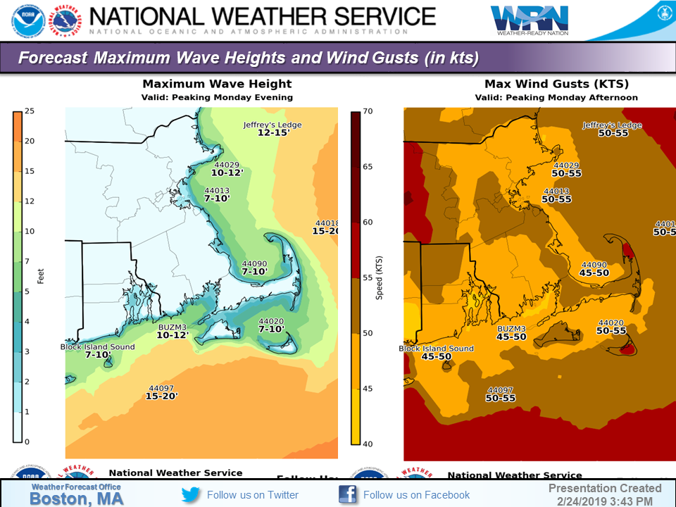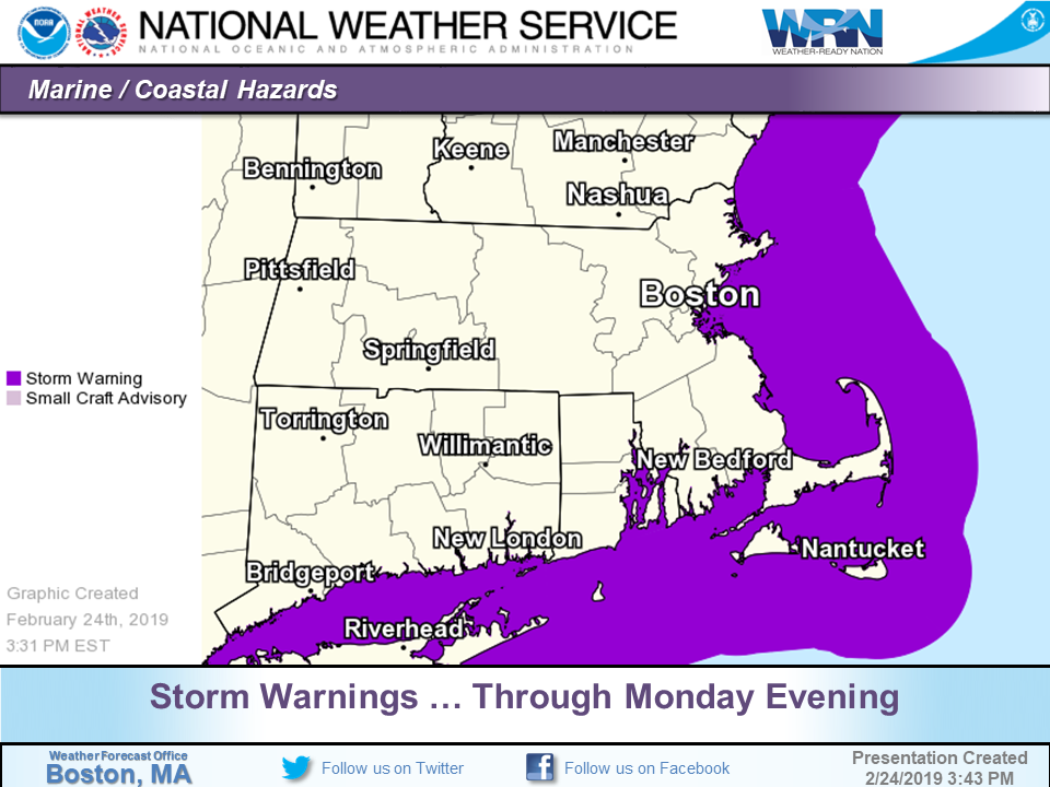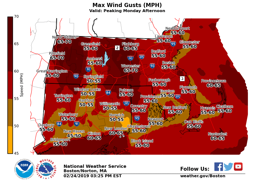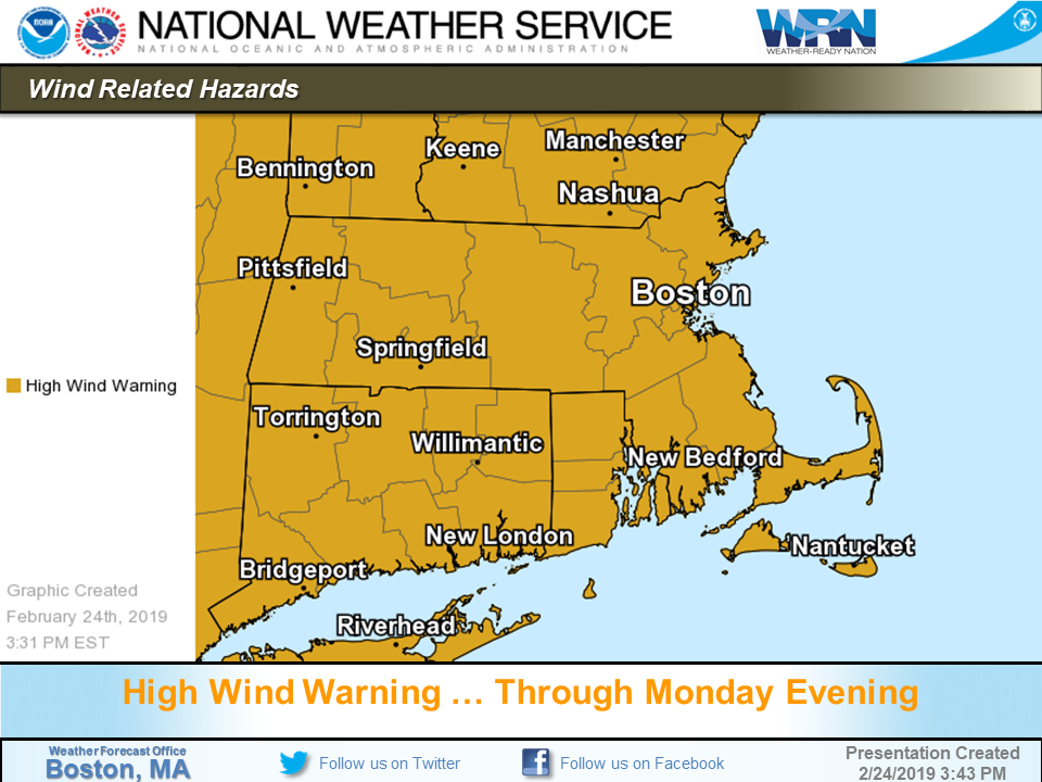 Good afternoon everyone, West to northwesterly winds will gradually increase during the overnight hours, peaking by Monday afternoon. *Headlines:* - *HIGH WIND WARNING* - High Wind Warning continues for all of Southern New England - *STORM WARNING* - All waters beginning tonight. *Winds* - *What:* Strong, damaging winds gusting 55 to 65 mph; potential for gusts as strong as 70 mph. Sustained winds of 25-40 mph at times are also possible. - *When:* Beginning tonight, peaking Monday afternoon, gradually diminishing early Tuesday. - *Impacts:* Downed tree limbs / trees and power lines. Scattered power outages and blocked roads likely due to tree / power line debris. Please let us know if you have an questions or concerns. - NWS Boston/Norton If you have any questions or would like more information, don't hesitate to contact us via this email address, on NWSChat <https://nwschat.weather.gov/>, or at the following: National Weather Service Boston/Norton, MA 46 Commerce Way Norton, MA 02766 508.622.3280 Website <http://www.weather.gov/boston> | Facebook <http://www.facebook.com/NWSBoston> | Twitter <http://www.twitter.com/NWSBoston>