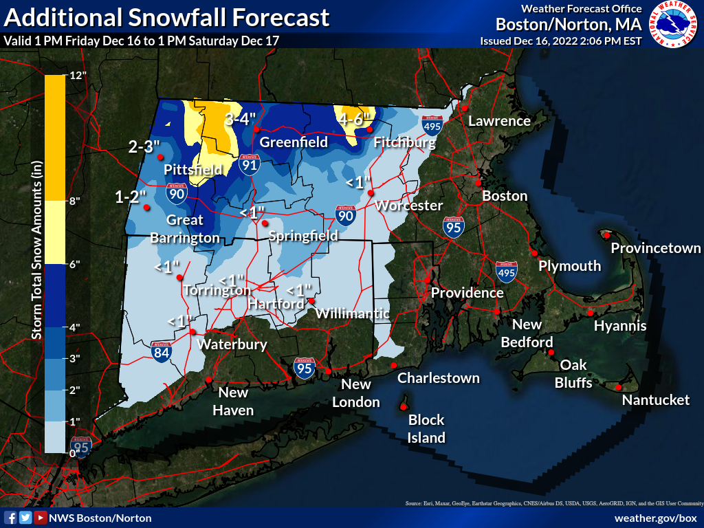 All, We wanted to send you this quick update to primarily pass along that the event is following along fairly closely to our previous forecasts. The highest snow accumulations have been primarily across the higher elevations, especially above 1000-1500 feet. That snow will continue this evening into the early overnight hours. We have added the far northwest corner of Middlesex County MA to our Winter Weather Advisory since the highest elevation towns (Ashby and Townsend) will see several inches of snow this evening. Rain will continue elsewhere. Winds will be diminishing this evening. As the storm winds down well after midnight and during Saturday morning, a brief period of light snow is expected even at lower elevations, however no significant accumulation is expected. Attached to this email is a forecast map for what we expect for additional snowfall amounts from this afternoon through early Saturday afternoon. Again, the biggest accumulations will be restricted to the highest elevation locations. If you have any questions or would like more information, don't hesitate to contact us via this email address. Thank You, Andy Nash, Torry Gaucher, Andrew Loconto