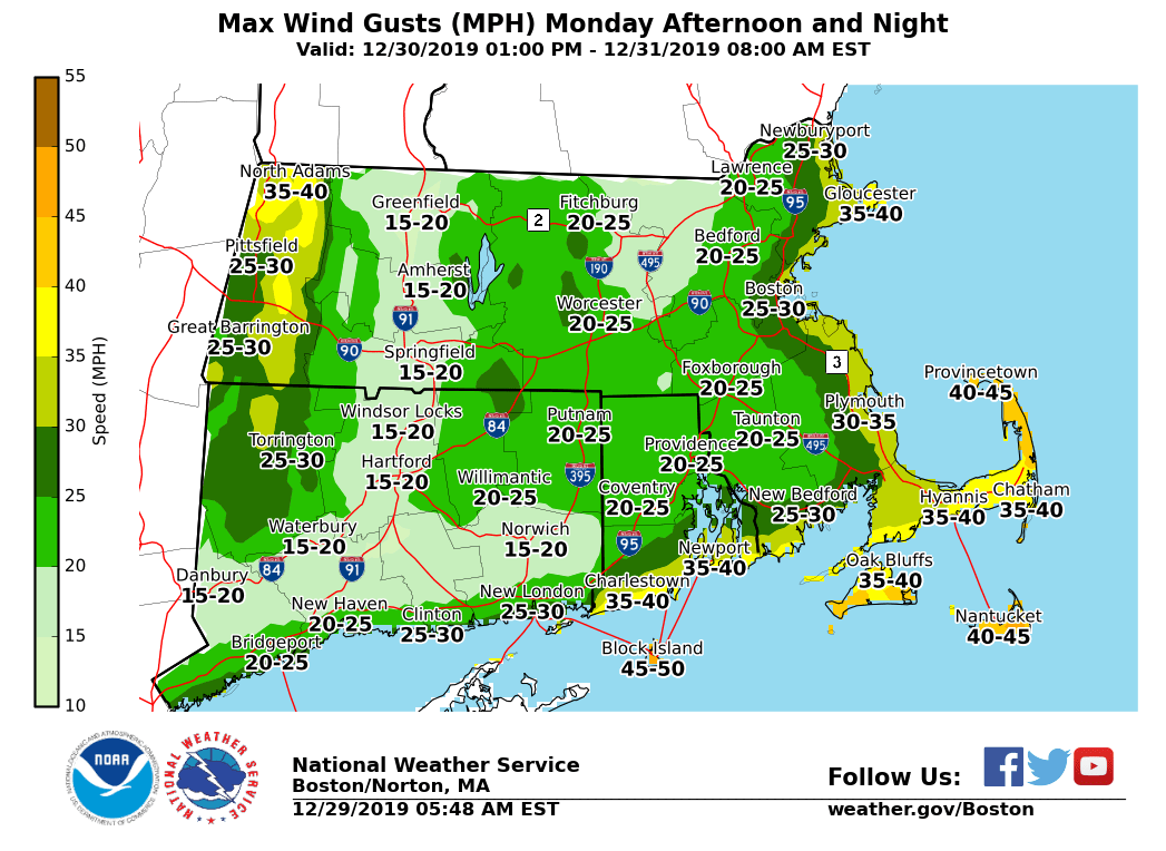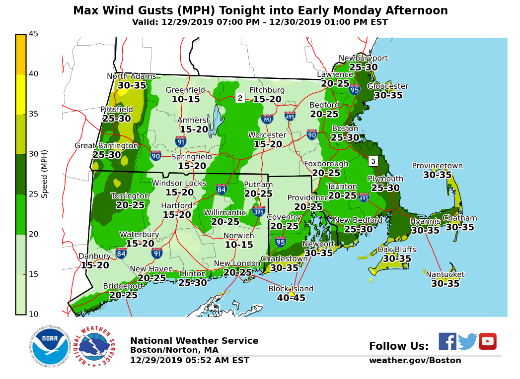 Good morning, Please note in the e-mail sent at 604 AM Sunday December 29th that it contains an incorrect date/time stamp in the subject line. Information contained in the e-mail is valid as of our morning forecast from Sunday, December 29th, and is forwarded below. Please accept my apologies for this oversight and potential source of confusion! Meteorologist: Andrew Loconto If you have any questions or would like more information, don't hesitate to contact us via this email address, on NWSChat <https://nwschat.weather.gov/>, or at the following: National Weather Service Boston/Norton, MA 46 Commerce Way Norton, MA 02766 508.622.3280 Website <http://www.weather.gov/boston> | Facebook <http://www.facebook.com/NWSBoston> | Twitter <http://www.twitter.com/NWSBoston> ---------- Forwarded message --------- From: BOX Operations - NOAA Service Account <box.operations@noaa.gov> Date: Sun, Dec 29, 2019 at 6:04 AM Subject: [2019.12.28 PM] NWS Boston EM Briefing: Significant Higher Elevation Icing Threat and Wintry Mix Tonight - Tuesday To: Good morning everyone, Here is the latest forecast information on a complicated storm system bringing concerns for significant higher-elevation icing and wintry mix of precipitation types for Southern New England tonight into Tuesday. *What Has Changed:* *Winter Headlines (In Effect Tonight through Tuesday AM, All Areas):* Ice Storm Warnings *for the eastern slopes of the Berkshires.* Predominantly freezing rain of a prolonged-duration is expected here, with the *most significant icing and impacts* expected for these locations. *Winter Storm Warning* *for northern Worcester County into northwest Middlesex County in MA. *Wintry mixture of freezing rain and sleet here, though greatest impact from freezing rain. *Significant icing and impacts* expected. Winter Weather Advisories *for most of the remainder of Southern New England (except southern RI, southern Plymouth & Bristol Counties in MA into Cape Cod and the Islands)*. Mix of precip types for these areas, with lesser though still impactful accretions of freezing rain and sleet (with snow possible northern MA). *Marine Headlines:* *Gale Warnings* for southern coastal offshore waters. In effect Monday 7 AM into early Tuesday. *Gale Watches* for eastern coastal and offshore waters. In effect Monday Night into Tuesday. =============================================== *Main Weather Concerns: * 1) *Higher Elevation Significant Icing in* *western MA (eastern slopes of the Berkshires) and north-central MA (Worcester County hills into northwest Middlesex County) developing tonight thru Monday night*. Icing is expected to begin in tonight and continue into Monday evening, with temperatures around 30 degrees. There is now high confidence in icing accumulations of a half-inch or greater in each area, with *local amounts up to one inch possible in the eastern slopes of the Berkshires where freezing rain is expected to predominate*. 2)* Lower Elevations: Lesser amounts of sleet and freezing rain develop tonight and continue through Monday. *Accumulations of freezing rain and sleet will affect the Monday morning commute. While freezing rain is still expected to continue across interior MA and northern CT for the afternoon commute, a wintry mix of sleet to rain is expected towards the MA East Coast. Icing amounts range from a light glaze to a quarter-inch, though *may locally be near a half-inch in spots N/W of I-84 and I-495 if freezing rain can remain more prolonged*. 3) A* brief period of snow* is possible at the end of the storm late Monday night into Tuesday, especially in northern Massachusetts near the New Hampshire border. Up to a couple inches of snow is expected in these areas. 4) *Strong east to northeast winds* are expected over the coastal waters and along the South Coast Monday night. Limited impact expected. =============================================== *Confidence...and what could still change:* We have high confidence that this storm system will occur and produce a wintry mix. Confidence has also increased on the potential for significant icing and impact in higher-elevation areas (e.g. those areas currently in Ice Storm and Winter Storm Warnings). Confidence on the distribution/duration of precipitation types is moderate outside of the two Ice Storm and Winter Storm Warning areas. This may result in further significant change in snow/sleet and ice accumulations - especially across northeast MA, southern interior MA on into northern CT. Supporting graphics are attached, including the current Winter headlines, Storm Total Icing, Onset, peak wind gusts tonight into Monday afternoon (e.g. period when icing is greatest), and peak wind gusts for Monday evening. Meteorologists: Andrew Loconto and Frank Nocera If you have any questions or would like more information, don't hesitate to contact us via this email address, on NWSChat <https://nwschat.weather.gov/>, or at the following: National Weather Service Boston/Norton, MA 46 Commerce Way Norton, MA 02766 508.622.3280 Website <http://www.weather.gov/boston> | Facebook <http://www.facebook.com/NWSBoston> | Twitter <http://www.twitter.com/NWSBoston>