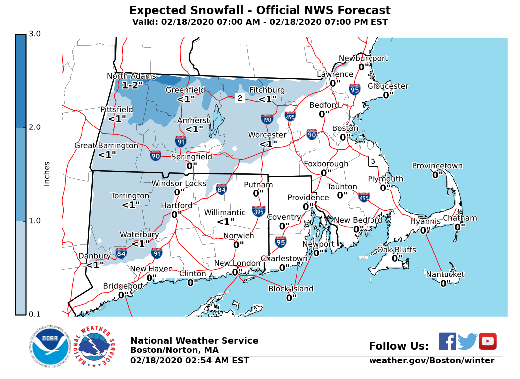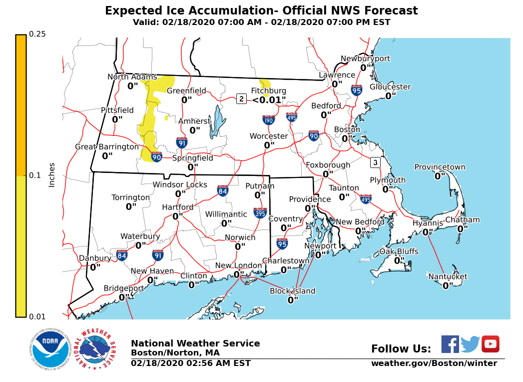 Good morning, Based on our morning forecast, the following is an update to the expected light wintry weather event today, bringing some slippery travel impacts mainly to elevations near and above 1000 ft. *Changes from Prior Briefing:* *Winter Weather Advisory for the eastern slopes of the Berkshires. In effect from 10 AM until 5 PM today. * *Details:* *What ... *A brief period of snow or sleet to light freezing rain, before changing over to all rain. *Where ...* Primarily the eastern slopes of the Berkshires; lesser snow & ice accumulation also possible into the Worcester Hills. *Timing ...* Starting as snow around mid-to-late-morning today; sleet and freezing rain early this afternoon, ending as rain into mid to late this afternoon. *Impacts ...* Untreated surfaces near and above 1000 ft will become slick from light icing and snow. Wet roads expected elsewhere. *Forecast Confidence ...* High confidence in a short-duration wintry weather event, with a light snow accumulation (coating to 2") and minor icing (trace to less than a tenth of an inch) at elevations near and above 1000 ft. Though minor impacts are expected, expansion of the Winter Weather Advisory into northern Worcester County may be needed if a greater areal coverage of icing becomes more likely. *Attached Graphics:* - Expected Snow Totals. - Expected Ice Accumulation. Thank You Meteorologist: Andrew Loconto If you have any questions or would like more information, don't hesitate to contact us via this email address, on NWSChat <https://nwschat.weather.gov/>, or at the following: National Weather Service Boston/Norton, MA 46 Commerce Way Norton, MA 02766 508.622.3280 Website <http://www.weather.gov/boston> | Facebook <http://www.facebook.com/NWSBoston> | Twitter <http://www.twitter.com/NWSBoston>