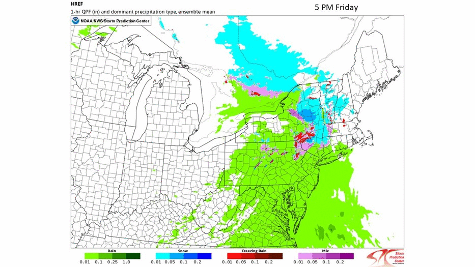 Hi everyone This is just a quick heads up email on the potential for some light ice accretion Friday night in the high terrain. We will attach an approximate radar simulation, which depicts an approximate timing and precipitation types and also include a brief outline in this email. *WHAT/WHERE: * - Light freezing rain potential Friday night in the high terrain of the Worcester Hills and the east slopes of the Berkshires. Ice accretion of a trace to one tenth of an inch possible. *WHEN: * - Precipitation overspreads the region from west to east on Friday evening roughly between 5 and 9 pm. Rain is expected for most of the region, but some light freezing rain will be possible in the high terrain of the Worcester Hills and east slopes of the Berkshires. *POTENTIAL IMPACTS: * - Most ice accretion will occur on trees, but a few slippery spots are possible at elevations over 1000 feet and particularly near 1500 feet. - Ice accretion amounts will not be high enough to result in any power outages. - Precipitation will change to rain toward daybreak Saturday in all locations. Temperatures will rise well into the 50s to 60s by Sunday afternoon. Please let us know if you have any questions or concerns. Thank You Meteorologist: Hayden Frank If you have any questions or would like more information, don't hesitate to contact us via this email address, on NWSChat <https://nwschat.weather.gov/>, or at the following: National Weather Service Boston/Norton, MA 46 Commerce Way Norton, MA 02766 508.622.3280 Website <http://www.weather.gov/boston> | Facebook <http://www.facebook.com/NWSBoston> | Twitter <http://www.twitter.com/NWSBoston>