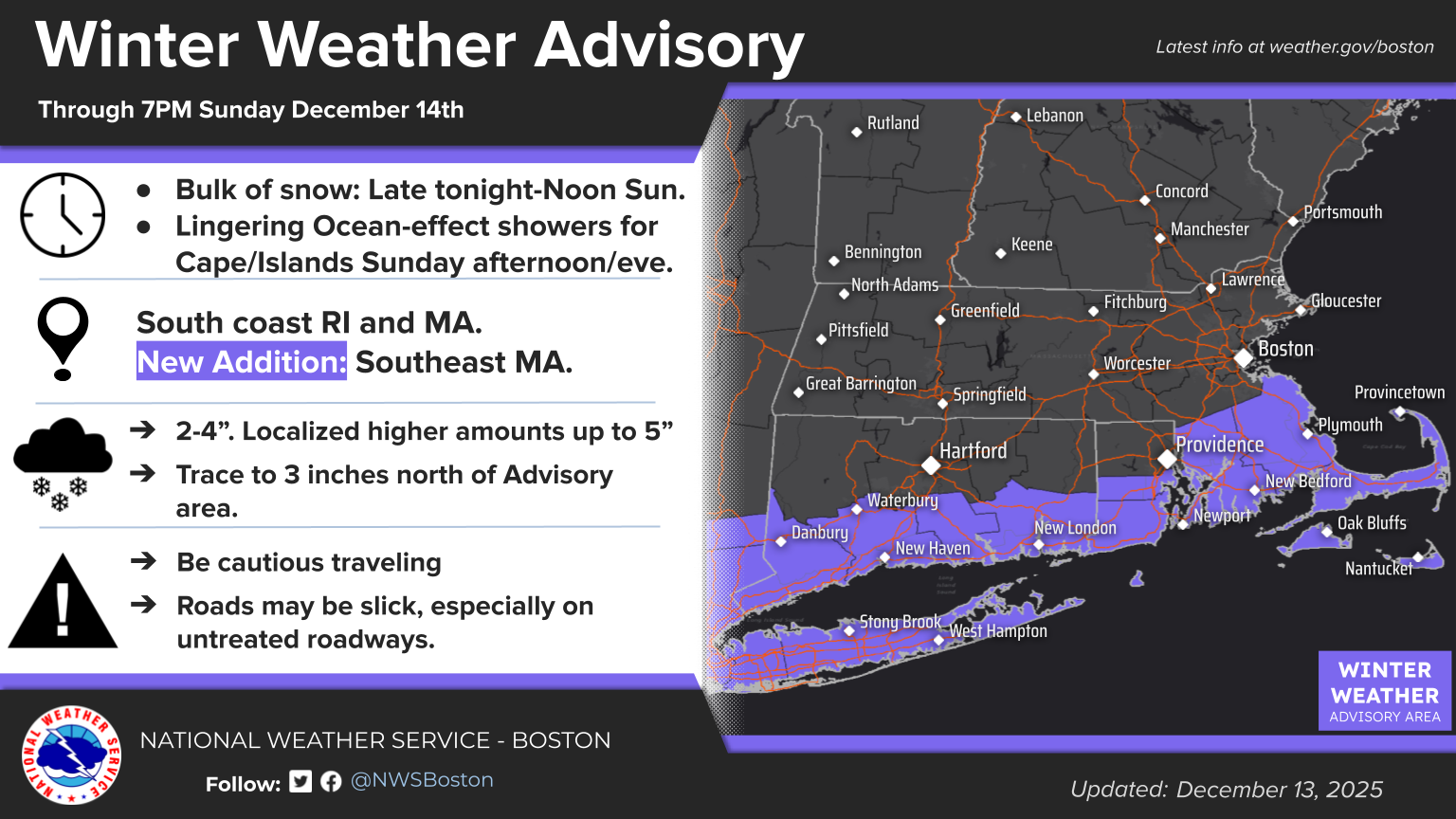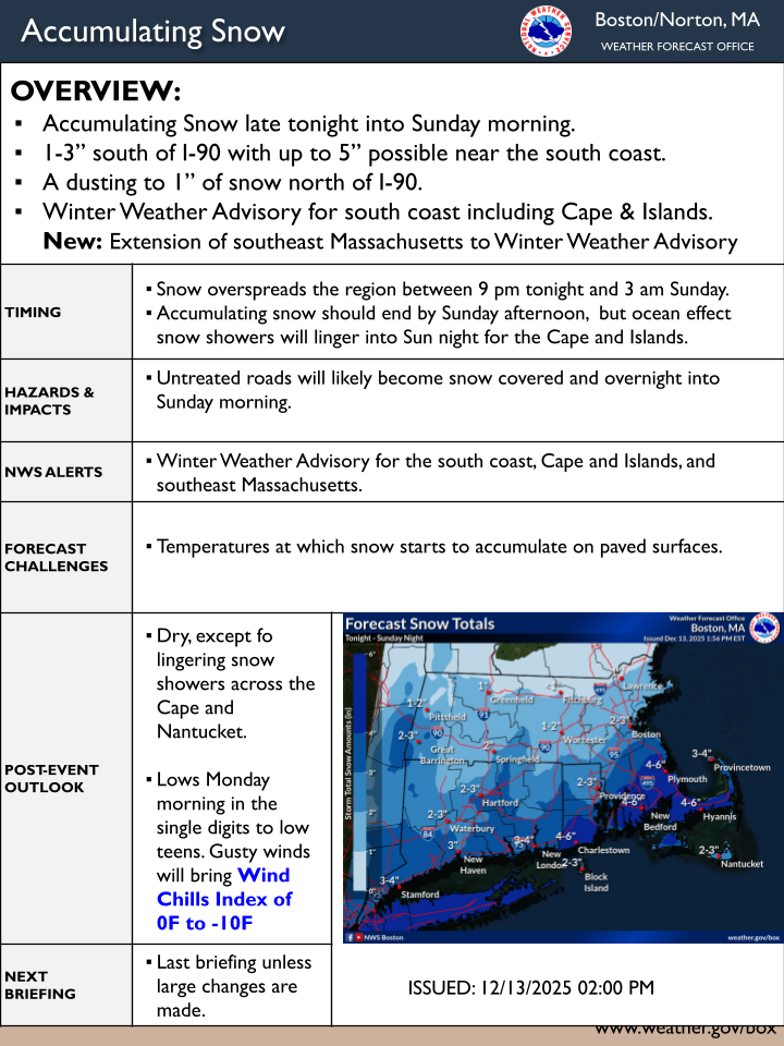 [2025.12.13 PM] NWS Boston EM Briefing: Accumulating Snow Late Tonight into Sunday