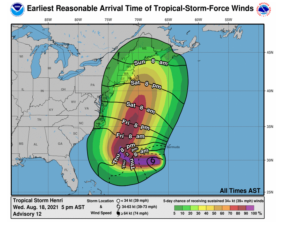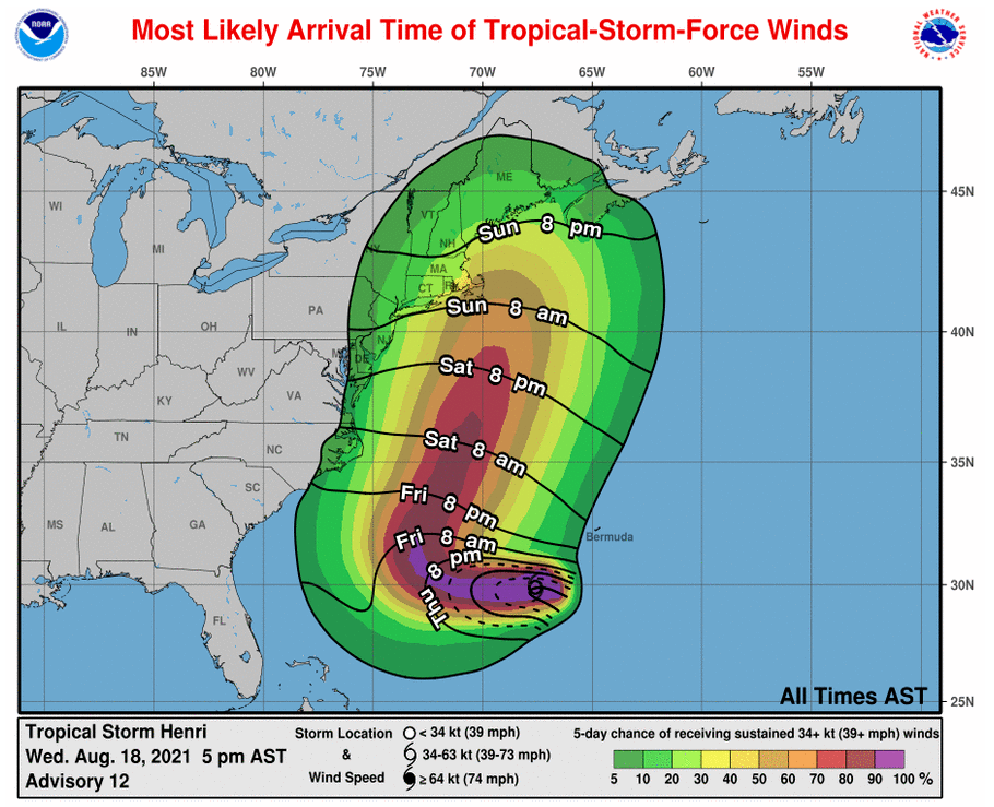 Good evening everyone, Little has changed regarding the potential for flooding overnight and Thursday. The greatest risk remains to the west of our region, but it's possible that portions of western/northwestern Massachusetts are affected by locally heavy rainfall and typical minor poor drainage flooding. We've attached an updated one-page briefing on Tropical Storm Henri along with updated graphics showing the most likely and earliest reasonable times of arrival of tropical storm force winds. The latest forecast track has Henri centered over Nantucket as a tropical storm at 2pm this Monday. Uncertainty in the forecast track remains fairly high and adjustments in the track are likely over the next few days. Potential impacts from Henri remain uncertain, but tropical storm force winds will be a possibility for portions of southern New England, especially for the outer Cape and Islands. High surf, dangerous rip currents, and rough seas may be an issue as well. Additionally, high astronomical tides may lead to some degree of coastal flooding. The severity of any coastal flooding will be dependent on the timing and track of the storm. If you have any questions or would like more information, don't hesitate to contact us via this email address, on NWSChat, or by phone at 508.622.3280. Thanks, Rob Megnia National Weather Service Boston/Norton, MA 46 Commerce Way Norton, MA 02766 508.622.3280 Website <http://www.weather.gov/boston> | Facebook <http://www.facebook.com/NWSBoston> | Twitter <http://www.twitter.com/NWSBoston>