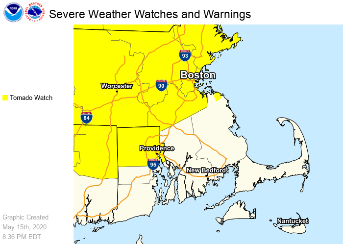 Hi Everyone, We have added Suffolk and Norfolk Counties in eastern Massachusetts (including Boston) and Providence County in Rhode Island to the Tornado Watch, which is in effect until 10 PM. The greatest threat for damaging winds and perhaps a tornado is in northeast Massachusetts, but there is the potential for damaging winds into metro Boston and northern Rhode Island. The line of storms will begin to weaken as it approaches Providence, RI and Hull, MA. Thanks, Joe DelliCarpini If you have any questions or would like more information, don't hesitate to contact us via this email address, on NWSChat <https://nwschat.weather.gov/>, or at the following: National Weather Service Boston/Norton, MA 46 Commerce Way Norton, MA 02766 508.622.3280 Website <http://www.weather.gov/boston> | Facebook <http://www.facebook.com/NWSBoston> | Twitter <http://www.twitter.com/NWSBoston>