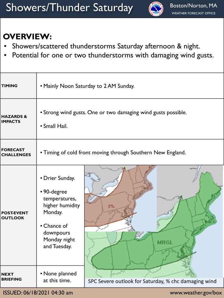 Good morning. A cold front will move through Southern New England Saturday bringing showers and scattered thunderstorms. The main risk will be isolated damaging wind, but occurrence of hail and cloud to ground lightning will also be possible. If you have any questions or would like more information, don't hesitate to contact us via this email address, on NWSChat <https://nwschat.weather.gov/>, or at the following: National Weather Service Boston/Norton, MA 46 Commerce Way Norton, MA 02766 508.622.3280 Website <http://www.weather.gov/boston> | Facebook <http://www.facebook.com/NWSBoston> | Twitter <http://www.twitter.com/NWSBoston>