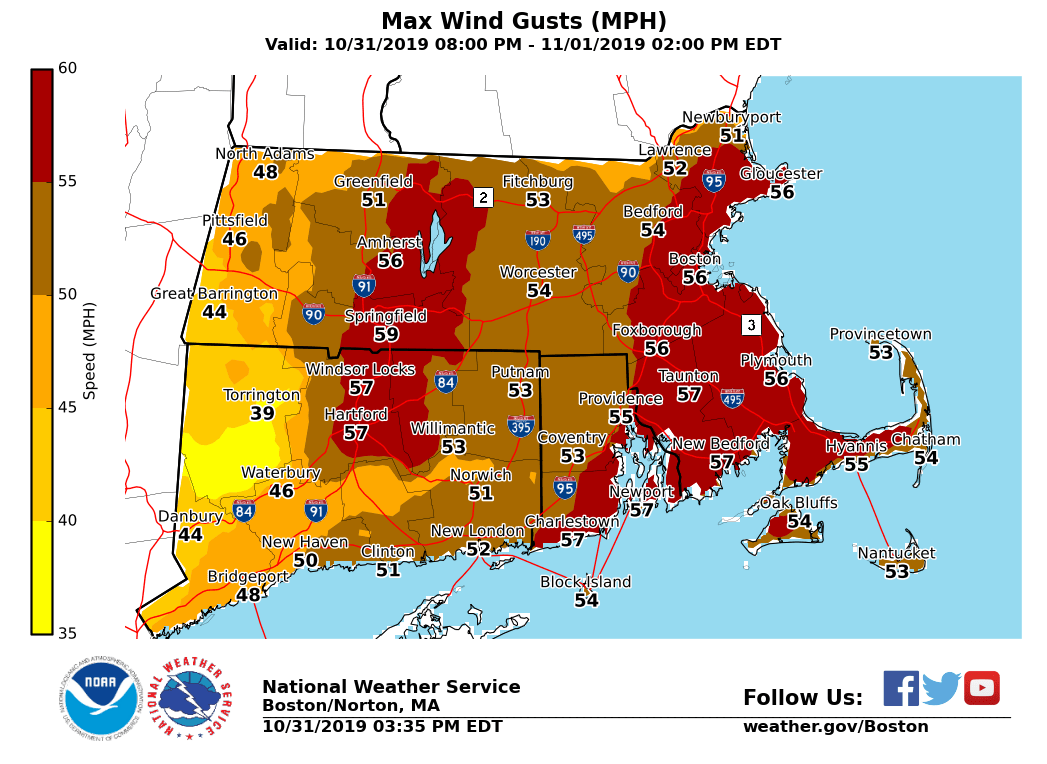 Good afternoon. A period of strong to damaging wind gusts are expected tonight into early Friday morning. *Headlines*: - High Wind Warning for easern Hampshire and Hampden counties MA & Hartford and Tolland counties CT from 9 PM tonight through 3 AM Saturday morning - High Wind Warning for eastern Massachusetts & Rhode Island from 11 PM tonight through 6 AM Saturday morning - Wind Advisory for Windham county CT and Worcester, Franklin, western Hampden and western Hampshire counties from 8 PM tonight through Noon on Saturday - Storm Warnings for Narragansett Bay, Boston Harbor, Cape Cod Bay, and Massachusetts/Ipswich Bays in effect from 11 PM tonight through 6 AM Saturday morning - Gale Warnings in effect for the remaining coastal waters through Friday *Details*: *Winds:* - *Timing and Peak Gusts:* - Strongest South winds will occur from 9 PM tonight through 8 AM Friday morning from west to east. - Expect gusts from 40-50 mph in the interior, with 50-60 mph possible across Rhode Island and eastern MA, including the Cape/Islands. - Another surge of strong west wind gusts to 40-50 mph are expected Friday morning, especially over the higher terrain in interior MA. - *Impacts:* Some tree damage with scattered power outages. - *Uncertainty:* There is still some uncertainty about how much of the strongest winds will mix to the ground. However, with temperatures in the upper 60s to lower 70s this afternoon, the probability for the strong winds to reach the surface is high. There will also be a narrow line of heavy showers along the front, which will increase the likelihood of strong to damaging winds. *Rain:* - *Timing:* Expect areas of showers tonight and Thursday, but the heaviest rainfall, possibly accompanied by a rumble or two of thunder, will occur across western and central MA and northern CT. - *Amounts:* 0.5 to 1.25 inches, heaviest across western Hampden, Hampshire and Franklin counties. - *Impacts*: Limited. Isolated poor drainage flooding possible from leaf-clogged storm drains. - *Uncertainty*: Any thunder may enhance rainfall rates. The updated graphics for the peak wind gusts (in MPH) and current headlines are attached. If you have any questions or would like more information, don't hesitate to contact us via this email address, on NWSChat <https://nwschat.weather.gov/>, or at the following: National Weather Service Boston/Norton, MA 46 Commerce Way Norton, MA 02766 508.622.3280 Website <http://www.weather.gov/boston> | Facebook <http://www.facebook.com/NWSBoston> | Twitter <http://www.twitter.com/NWSBoston>
