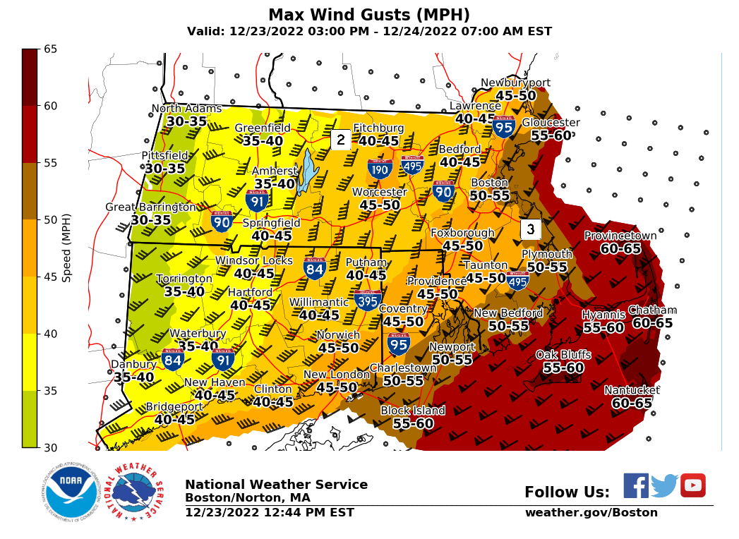 Good afternoon everyone, Just wanted to provide a quick email update. The forecast remains on track. There is a little bit of a lull in the strong winds as of 12 to 1 PM, but we will see another surge of gusty winds between 4-7 PM of 40-60 mph gusts (graphic attached). The highest gusts are expected across eastern areas. Precipitation will taper off mid to late this afternoon ending as non accumulating snow. Ocean effect snow showers will persist across the south coast on Saturday and into Sunday with light accumulation. If you have any questions or would like more information, don't hesitate to contact us via this email address, on NWSChat <https://nwschat.weather.gov/>, or at the following: National Weather Service Boston/Norton, MA 46 Commerce Way Norton, MA 02766 508.622.3280 Website <http://www.weather.gov/boston> | Facebook <http://www.facebook.com/NWSBoston> | Twitter <http://www.twitter.com/NWSBoston>