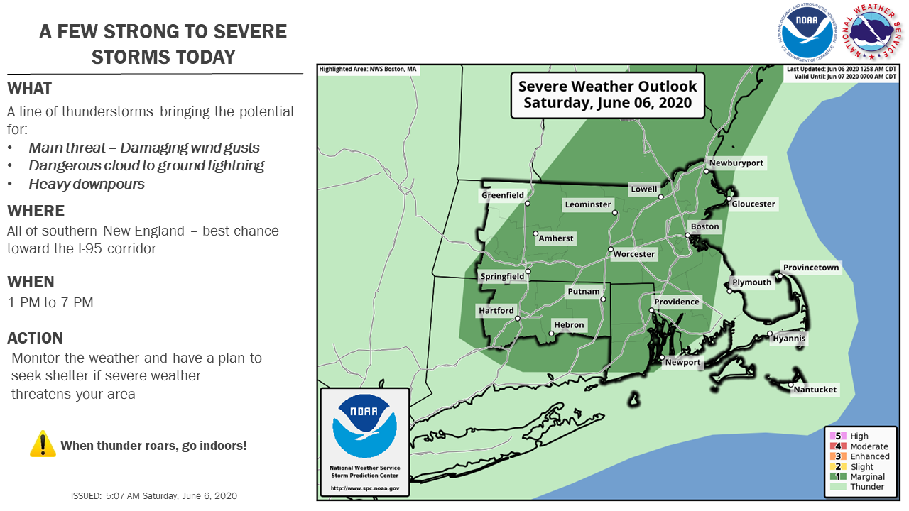 Good morning, A few strong to severe thunderstorms are possible this afternoon, generally between 1 PM and 7 PM. The greatest risk is toward the I-95 corridor including Boston and Providence. The main threat from these storms will be strong to damaging winds. Let us know if you have any questions! Bryce Williams and Hayden Frank If you have any questions or would like more information, don't hesitate to contact us via this email address, on NWSChat <https://nwschat.weather.gov/>, or at the following: National Weather Service Boston/Norton, MA 46 Commerce Way Norton, MA 02766 508.622.3280 Website <http://www.weather.gov/boston> | Facebook <http://www.facebook.com/NWSBoston> | Twitter <http://www.twitter.com/NWSBoston>