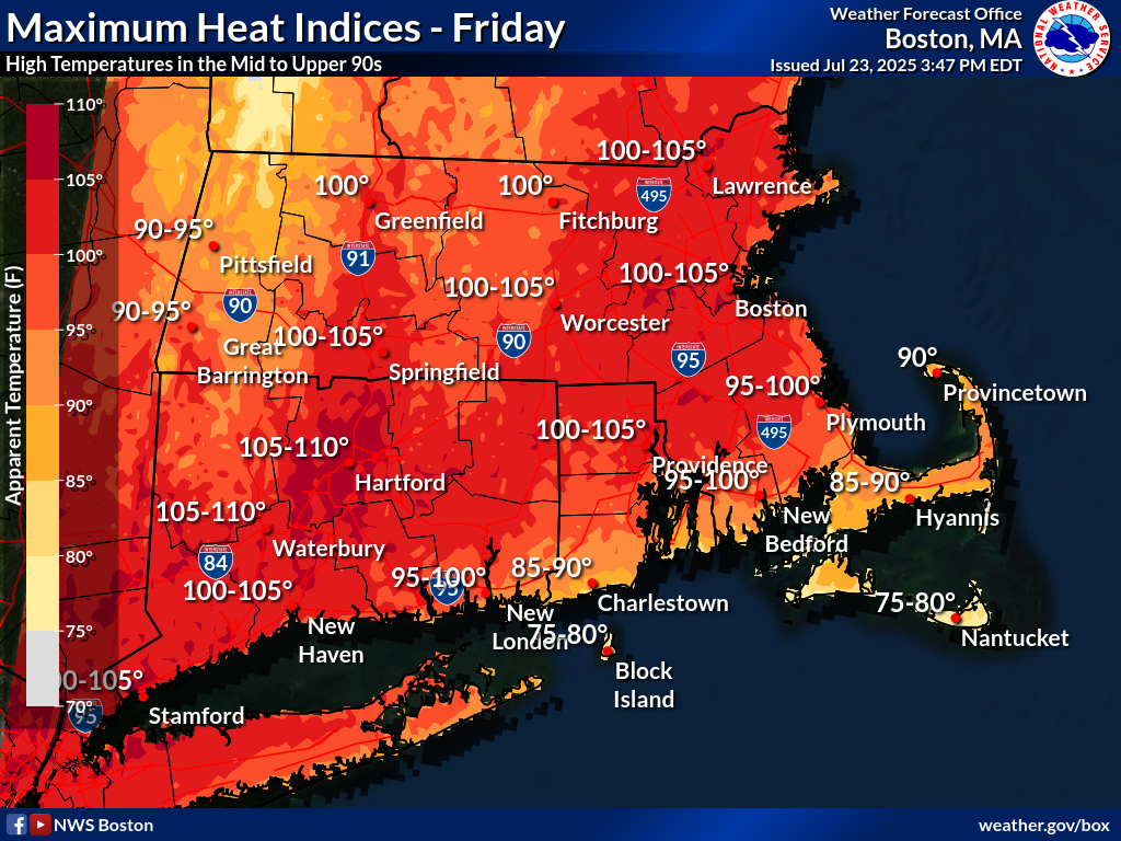 Good afternoon, Following is an update to the briefing sent this morning regarding elevated to dangerous heat indices late this week, along with a risk for severe thunderstorms Friday. *Changes Since Last Briefing:* Heat Advisories are in effect for Friday from 11 AM - 8 PM for a large portion of Southern Connecticut. Although we still expect heat indices to become elevated tomorrow in the mid 90s, dangerous heat indices remain expected on Friday, with values in the 95 to 103 degree range with isolated values of 105+ degrees. We may also see elevated heat indices in the mid 90s along the RI and MA South Coast Friday, but southwest winds off the water may cut into the heat to an extent. Strong thunderstorms are possible on Friday as well, capable of localized straight-line wind damage as well as torrential rainfall capable of isolated instances of street flooding. Although there are still some details to iron out, a best estimate for the arrival of these storms is between 3 and 10 PM. Expect the next update to this briefing on Thursday morning. Thank You! Meteorologists: Andrew Loconto and Candice Hrencecin If you have any questions or would like more information, please don't hesitate to contact us. You can reach us via: email: box.operations@noaa.gov phone: 508.622.3280 Slack/NWSChat 2.0 <https://nwschatws.slack.com/> (for approved partners) social media: Website <http://www.weather.gov/boston> | Facebook <http://www.facebook.com/NWSBoston> | Twitter <http://www.twitter.com/NWSBoston>
