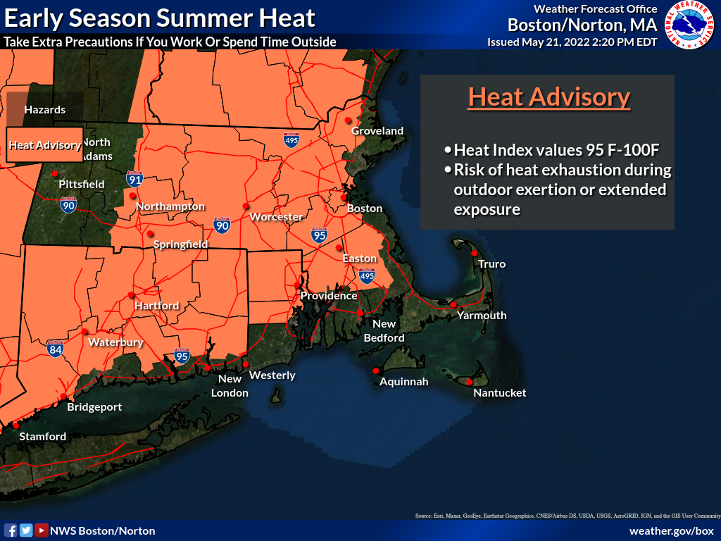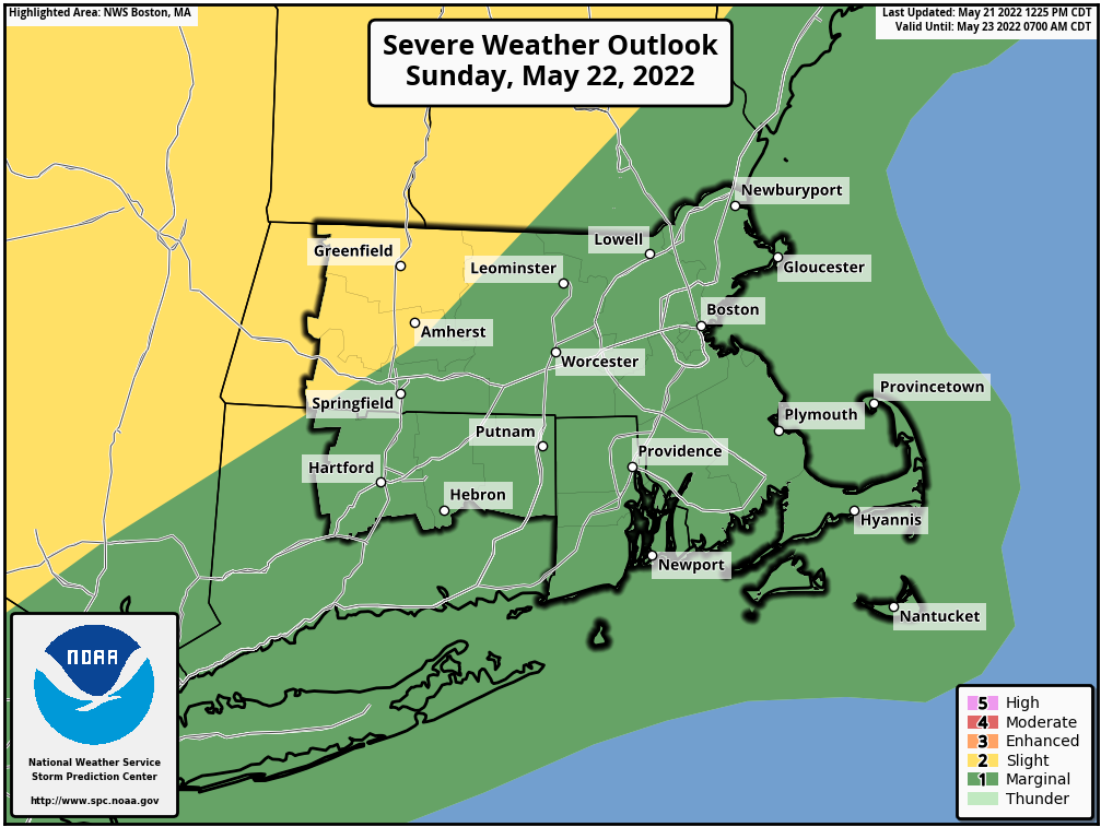 Good afternoon everyone, Attached is the latest one page briefing on the active heat advisory as well as the potential for severe thunderstorms tomorrow afternoon. *Heat:* Heat advisory remains in effect through tomorrow. Expect another afternoon with heat indices ranging from 95-100 degrees. Temperatures will be cooler along the immediate coast. *Severe Thunderstorm Threat:* Since the last briefing The Storm Prediction Center has expanded the slight risk zone further east into the forecast area. Greatest threat for severe thunderstorms will be across western MA and CT. The window for severe storms will be between 2 and 10 pm. Primary hazard will be damaging wind gusts. Small hail will be possible as well. Please see the one page briefing and supporting graphics for additional details. Have a great weekend, Rob Megnia If you have any questions or would like more information, don't hesitate to contact us via this email address, on NWSChat <https://nwschat.weather.gov/>, or at the following: National Weather Service Boston/Norton, MA 46 Commerce Way Norton, MA 02766 508.622.3280 Website <http://www.weather.gov/boston> | Facebook <http://www.facebook.com/NWSBoston> | Twitter <http://www.twitter.com/NWSBoston>