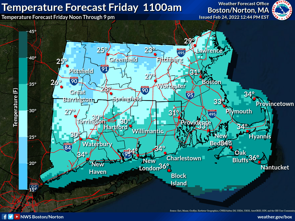 Good afternoon everyone, *What has changed:* winter storm watches have been converted to winter storm warnings across northern CT/RI and nearby southeast MA. Winter storm watches farther south have been converted to winter weather advisories from central RI to the south coast, including south coastal MA and Cape Cod. Attached is our updated winter storm briefing for Friday, including a loop of expected precipitation type, hourly snowfall rates and hourly temperatures Friday, indicating cold air coming back into RI & eastern MA beginning 4-7 pm, resulting in any leftover slush or residual road moisture quickly freezing, hence a flash freeze that may impact the late day commute. Kevin Cadima & Frank Nocera If you have any questions or would like more information, don't hesitate to contact us via this email address, on NWSChat <https://nwschat.weather.gov/>, or at the following: National Weather Service Boston/Norton, MA 46 Commerce Way Norton, MA 02766 508.622.3280 Website <http://www.weather.gov/boston> | Facebook <http://www.facebook.com/NWSBoston> | Twitter <http://www.twitter.com/NWSBoston>
