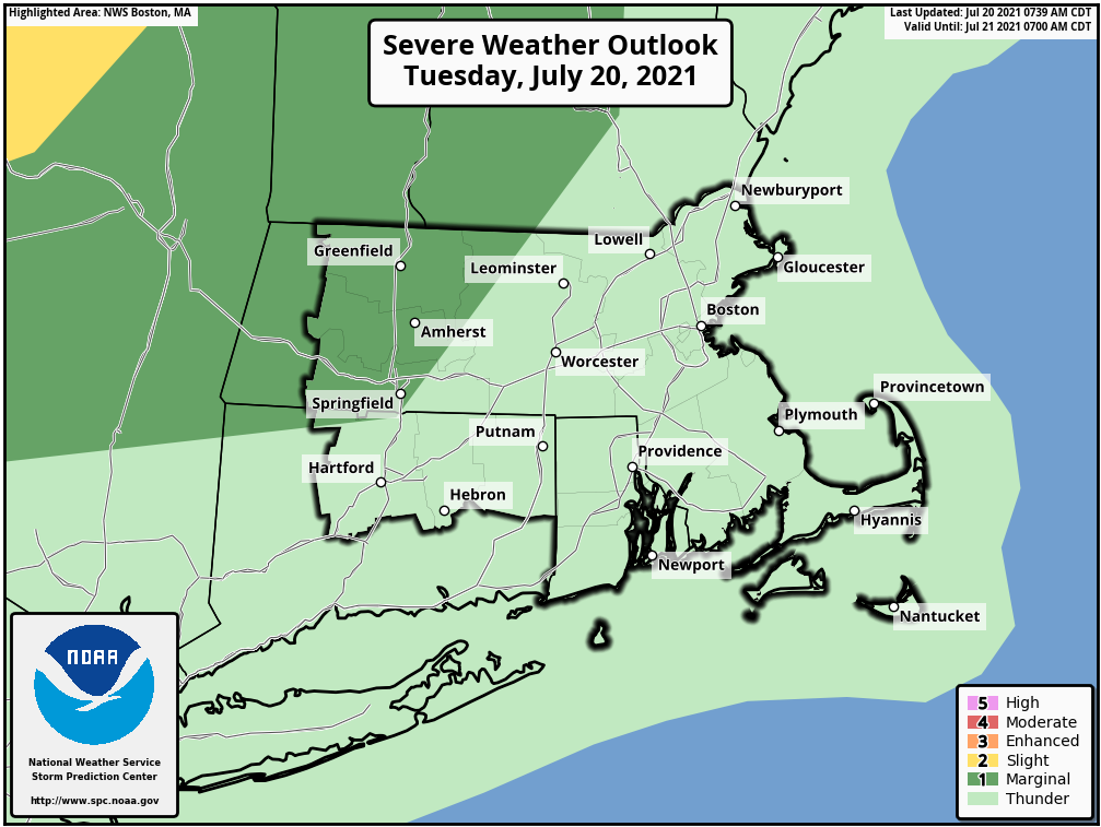 Good morning everyone, The Storm Prediction Center upgraded the severe weather threat today from General risk to Marginal risk for western MA. This is *NOT* expected to be a widespread or high impact event. However, we can't rule out one or two strong to severe thunderstorms later today/this evening from 6 pm to midnight. Frank Nocera If you have any questions or would like more information, don't hesitate to contact us via this email address, on NWSChat <https://nwschat.weather.gov/>, or at the following: National Weather Service Boston/Norton, MA 46 Commerce Way Norton, MA 02766 508.622.3280 Website <http://www.weather.gov/boston> | Facebook <http://www.facebook.com/NWSBoston> | Twitter <http://www.twitter.com/NWSBoston>