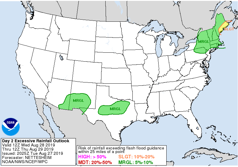 Hi everyone, We wanted to give everyone a heads up on the potential for locally heavy rainfall later Wednesday and Wednesday night which may lead to a risk of localized flash flooding. Details follow below. *What:* - Localized heavy rainfall with rainfall rates 1-2 inches/per hour - Urban and poor drainage flooding possible *Where:* - All of southern New England, but a greater risk across eastern MA and RI *When:* - Late Wednesday and Wednesday night - The greatest risk will be Wednesday night *Uncertainty:* - The heaviest rainfall amounts and potential flooding will be localized and may occur anywhere across southern New England If you have any questions or would like more information, don't hesitate to contact us via this email address, on NWSChat <https://nwschat.weather.gov/>, or at the following: National Weather Service Boston/Norton, MA 46 Commerce Way Norton, MA 02766 508.622.3280 Website <http://www.weather.gov/boston> | Facebook <http://www.facebook.com/NWSBoston> | Twitter <http://www.twitter.com/NWSBoston>