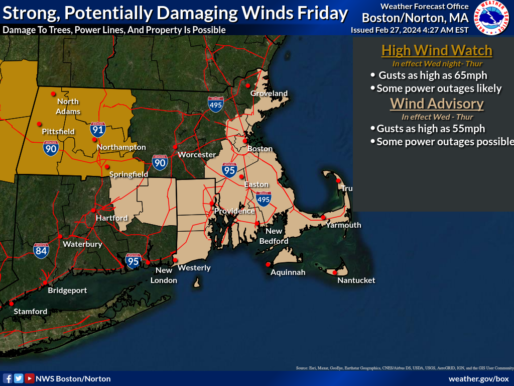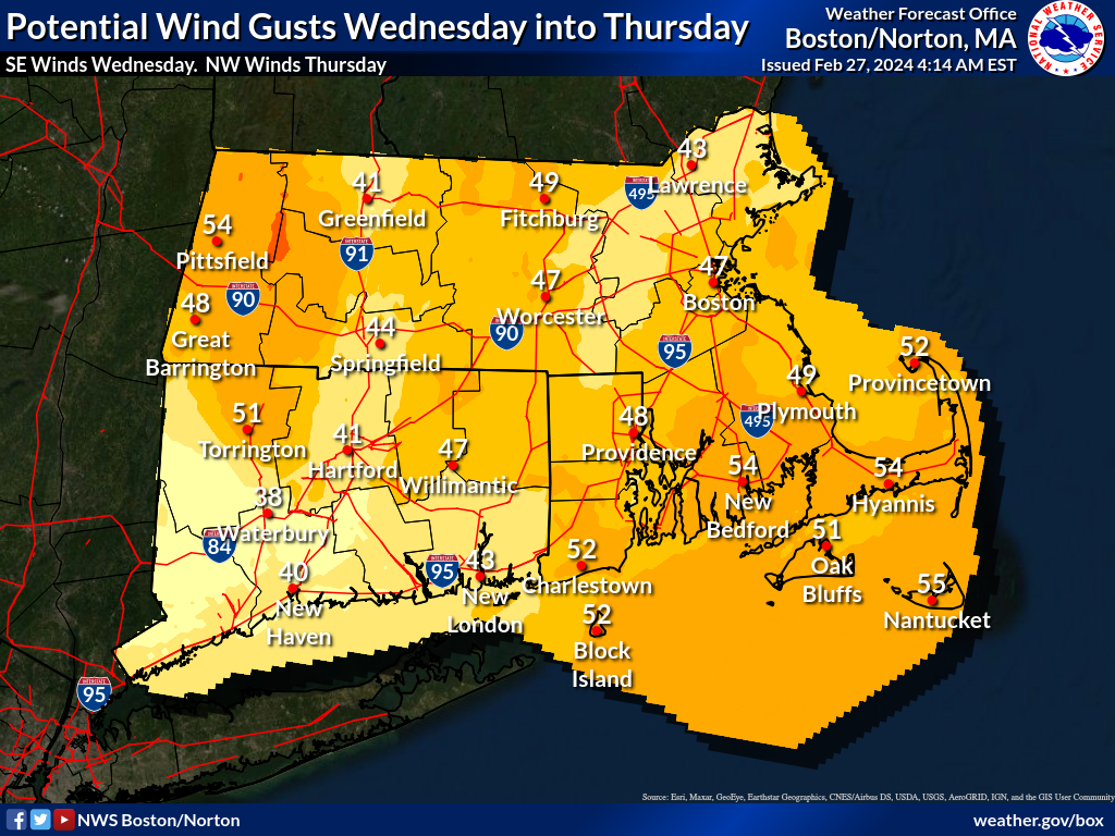 Good morning, Forecast confidence continues to grow in a strong to damaging wind event to occur in southern New England Wednesday through Thursday. A Wind Advisory is in effect for the I-95 corridor in Massachuests and Rhode Island, Cape Cod and the Islands, and NE Connecticut. A High Wind Watch is in effect for the Berkshires. We still anticipate two surges of wind. The first surge will be Wednesday afternoon to evening with strong south winds. The second surge of wind will occur overnight Wednesday into Thursday morning with strong to damaging northwest winds. Heavy windswept rain will likely cause hazardous travel Wednesday night. Rain briefly turns to snow as temperatures come crashing into the 20s behind the cold front. Not expecting snow accumulations at this time. Kyle Pederson and Matthew Belk If you have any questions or would like more information, please don't hesitate to contact us. You can reach us via: email: box.operations@noaa.gov phone: 508.622.3280 Slack/NWSChat 2.0 <https://nwschatws.slack.com/> (for approved partners) social media: Website <http://www.weather.gov/boston> | Facebook <http://www.facebook.com/NWSBoston> | Twitter <http://www.twitter.com/NWSBoston>
