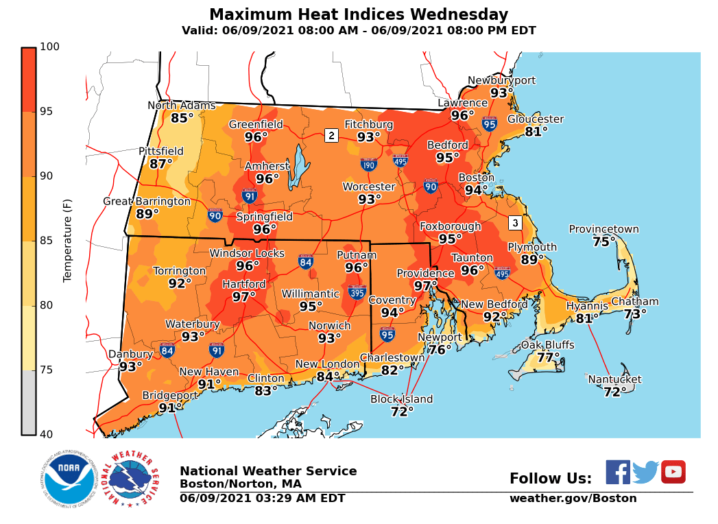Good morning, Please find attached our latest briefing for the ongoing oppressive heat and the risk for scattered afternoon thunderstorms for today. *What has changed:* Heat Advisories for most (excluding the Berkshires, western and southern Connecticut and coastal sections of Massachusetts and Rhode Island). In effect from noon to 8 PM Wednesday. Heat indices are expected to rise into the mid to upper 90s in the Heat Advisory area. In addition, scattered thunderstorms will develop this afternoon and move from north to south. Heavy rain capable of localized street flooding is the main risk, but an isolated severe wind gust is possible. Cooler and much less humid weather will return on Thursday. Unless significant changes warrant otherwise, this will be the final briefing on the oppressive heat and humidity. Thank You! Meteorologists: Andrew Loconto and Matt Belk If you have any questions or would like more information, don't hesitate to contact us via this email address, on NWSChat <https://nwschat.weather.gov/>, or at the following: National Weather Service Boston/Norton, MA 46 Commerce Way Norton, MA 02766 508.622.3280 Website <http://www.weather.gov/boston> | Facebook <http://www.facebook.com/NWSBoston> | Twitter <http://www.twitter.com/NWSBoston>