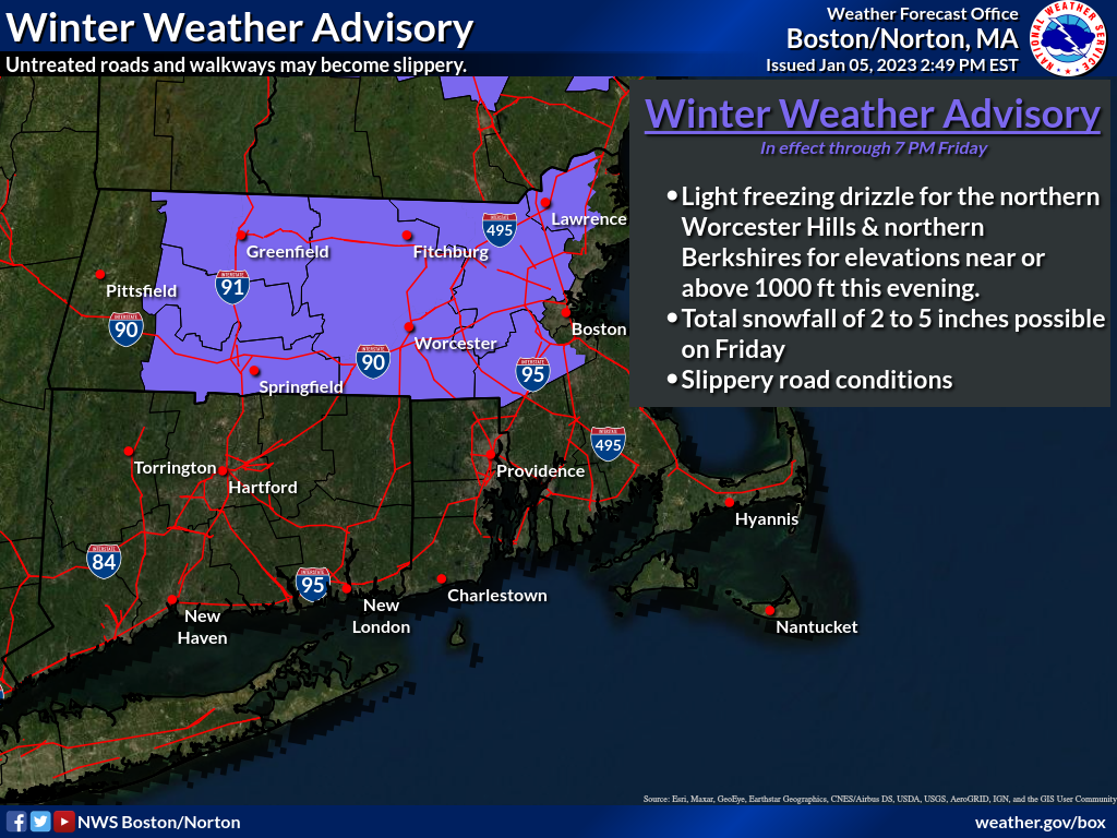 Good afternoon everyone, Attached is our latest briefing regarding the light icing possible for elevations at or above 1,000 ft this evening and accumulating snowfall on Friday. Please see the attached briefing for more details. Thanks, Bill Leatham and Matthew Belk If you have any questions or would like more information, don't hesitate to contact us via this email address, on NWSChat <https://nwschat.weather.gov/>, or at the following: National Weather Service Boston/Norton, MA 46 Commerce Way Norton, MA 02766 508.622.3280 Website <http://www.weather.gov/boston> | Facebook <http://www.facebook.com/NWSBoston> | Twitter <http://www.twitter.com/NWSBoston>