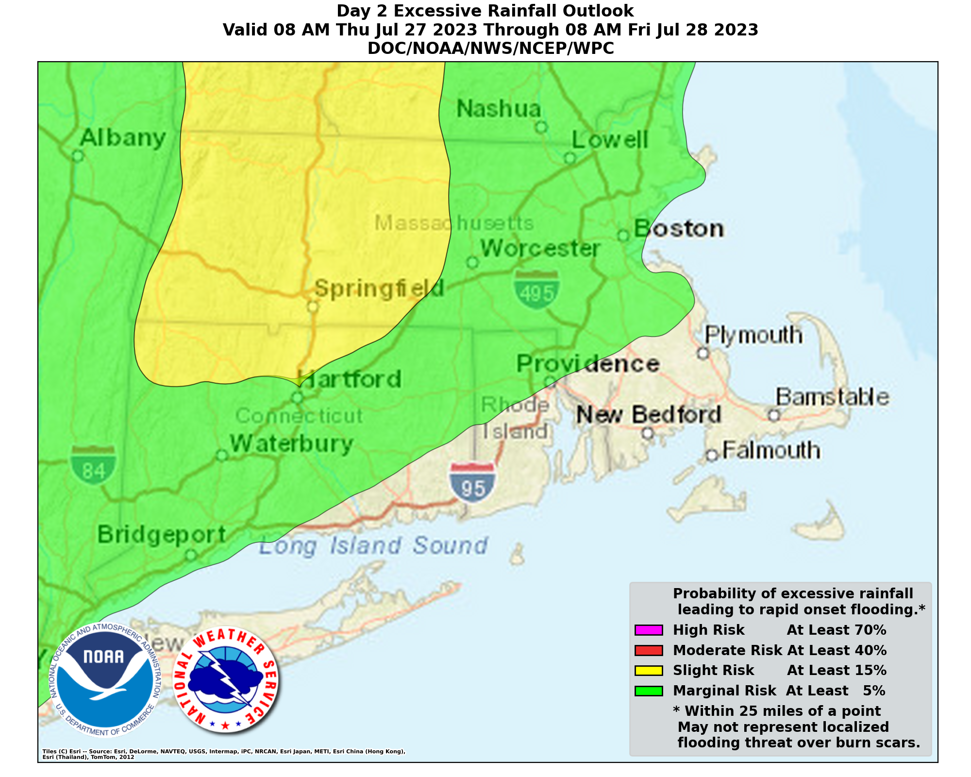 Good morning, Attached is our latest one pager regarding the dangerous heat anticipated late this week and perhaps lingering into Saturday. We've also attached the latest risks for severe thunderstorms and excessive rainfall (flash flood risk) for Thursday. There has been little change since our previous update, but we wanted to highlight the flood risk given how wet we've been. Please see the attached information for more details. Thanks, Bill Leatham and Andrew Loconto If you have any questions or would like more information, don't hesitate to contact us via this email address, on NWSChat <https://nwschat.weather.gov/>, or at the following: National Weather Service Boston/Norton, MA 46 Commerce Way Norton, MA 02766 508.622.3280 Website <http://www.weather.gov/boston> | Facebook <http://www.facebook.com/NWSBoston> | Twitter <http://www.twitter.com/NWSBoston>