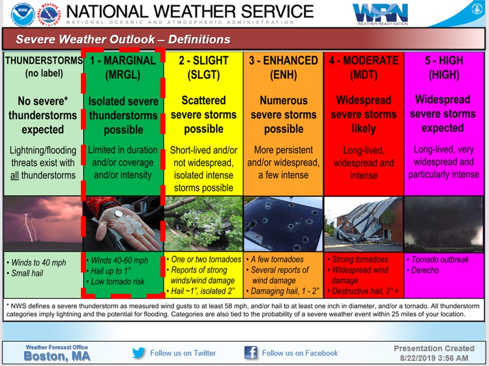 Good morning. There is a Marginal risk of Severe Thunderstorms in Southern New England today. The air is not as unstable as yesterday but could still produce isolated damaging weather. Also a large amount of water remains available to produce heavy downpours. *WHAT/WHEN:* - Scattered strong to severe thunderstorms with the main risk from 2 to 10 pm. *WHERE:* - All of southern New England is at risk, but the greatest risk is the eastern half of Massachusetts (Worcester County and east), all of Rhode Island, and Northern Connecticut. *POTENTIAL IMPACTS:* - Damaging wind gusts are the primary threat - Heavy downpours from thunderstorms could cause a local flash flood threat. - Large hail is a secondary threat. - Low risk for an isolated tornado. - Dangerous cloud to ground lightning will pose a risk to those with outdoor activities, including mariners and beach goers. If you have any questions or would like more information, don't hesitate to contact us via this email address, on NWSChat <https://nwschat.weather.gov/>, or at the following: National Weather Service Boston/Norton, MA 46 Commerce Way Norton, MA 02766 508.622.3280 Website <http://www.weather.gov/boston> | Facebook <http://www.facebook.com/NWSBoston> | Twitter <http://www.twitter.com/NWSBoston>