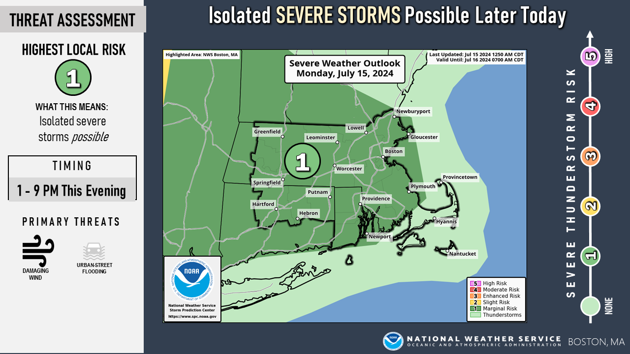 Good morning everyone! The only change to the forecast was to add northern Worcester county to the Heat Advisory. Otherwise...the Heat Advisory remains in effect through Wednesday for all but the Cape/Islands and Berkshires. Relief from the heat and humidity is still on track for Thursday, Friday and Saturday with a return to seasonable temperatures and much more comfortable humidity. We included the graphic of the Heat Advisory as well as the expected Heat Indices today, Tuesday and Wednesday. We also should mention there is the risk for mainly afternoon and evening scattered showers and thunderstorms today and Tuesday. The activity may be more widespread later Wednesday into Wednesday night as a cold front crosses the region. There is the risk for isolated strong to severe thunderstorms later today and we have included a graphic for that. There also is the potential for scattered strong to severe thunderstorms Tuesday and Wednesday afternoon & evening. Please let us know if you have any questions or concerns. Thank You! Meteorologist: Hayden Frank If you have any questions or would like more information, please don't hesitate to contact us. You can reach us via: email: box.operations@noaa.gov phone: 508.622.3280 Slack/NWSChat 2.0 <https://nwschatws.slack.com/> (for approved partners) social media: Website <http://www.weather.gov/boston> | Facebook <http://www.facebook.com/NWSBoston> | Twitter <http://www.twitter.com/NWSBoston>