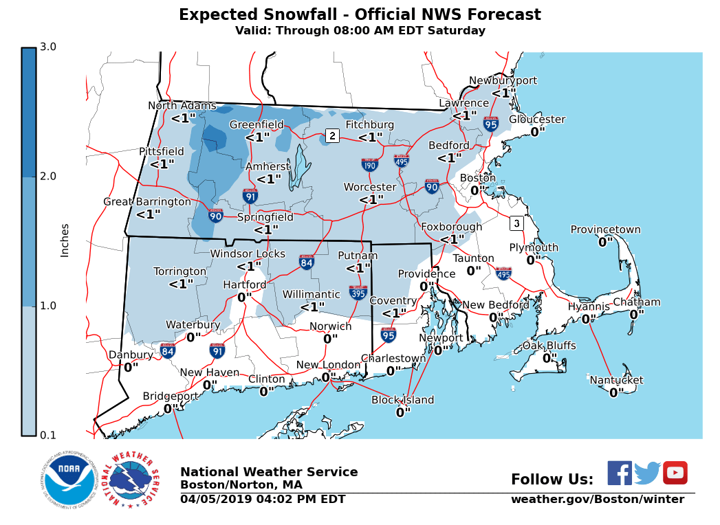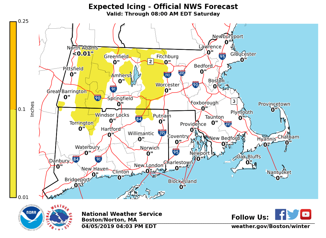 Good afternoon, all: The previous message has been included. The only items changed are the snow and ice accumulation attachments. *What Remains the Same*: - Winter Weather Advisory for the Berkshires, including the east slopes - Snow and sleet accumulation before a transition to freezing rain, then rain - A few inches of snow and sleet may accumulate before the transition to freezing rain and rain - - up to a few hundredths inch of ice accretion is possible *What Will Be Changing:* - Special Weather Statement will be issued for the threat of freezing rain - Not as confident freezing rain will be widespread - Risk of freezing rain across central and western Massachusetts, as well as northern Connecticut - Especially at elevations of 1,000 ft or higher - Up to a few hundredths inch of ice accretion is possible Matthew Belk If you have any questions or would like more information, don't hesitate to contact us via this email address, on NWSChat <https://nwschat.weather.gov/>, or at the following: National Weather Service Boston/Norton, MA 46 Commerce Way Norton, MA 02766 508.622.3280 Website <http://www.weather.gov/boston> | Facebook <http://www.facebook.com/NWSBoston> | Twitter <http://www.twitter.com/NWSBoston>