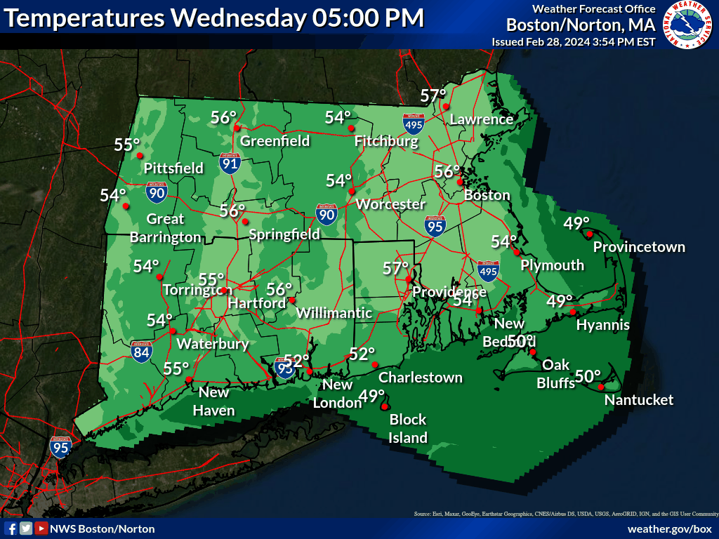 Good afternoon, Attached is our final weather briefing for this event. Overall not much of a change in the forecast, but the Wind Advisory for Berkshire, western Franklin, western Hampshire and western Hampden counties has been upgraded to a High Wind Warning. Our second surge of strong to damaging winds occurs this evening from west to east as a cold front sweeps through. Winds rapidly shift to the west and northwest as the front slides through. Rain will briefly change over to snow as precipitation winds down and temperatures will be crashing. Snow accumulations will be limited to a coating to an inch, with an inch most likely across the higher elevations. There is a low risk for isolated icy spots, especially where minor accumulation occurs. The strong winds and rapid drying will dry out pavement before any freezing occurs in most spots. Please see the attached images for more detailed information. Thanks, Bill Leatham, Kevin Cadima, Kristie Smith and Hayden Frank If you have any questions or would like more information, please don't hesitate to contact us. You can reach us via: email: box.operations@noaa.gov phone: 508.622.3280 Slack/NWSChat 2.0 <https://nwschatws.slack.com/> (for approved partners) social media: Website <http://www.weather.gov/boston> | Facebook <http://www.facebook.com/NWSBoston> | Twitter <http://www.twitter.com/NWSBoston>