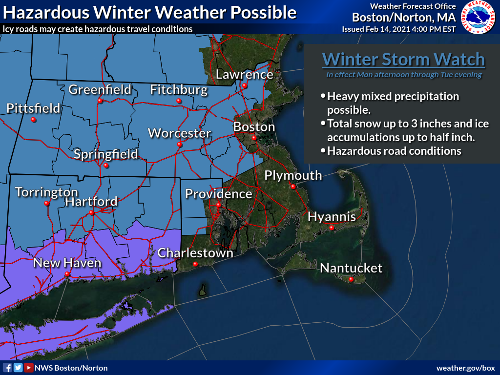 Good afternoon, Here is an updated one-pager briefing on the potential winter storm for Monday night into Tuesday. Main change...A Winter Storm Watch has been issued for much of interior MA, northern CT and northern RI for heavy mixed precipitation with up to half an inch of ice accretion possible. We have also attached an updated hazard map and snowfall map for Monday afternoon into Tuesday. Only minor snow accumulations are expected in northern MA with the main concern being the potential for significant ice accretion across much of interior Southern New England. The next briefing will be no later than Monday, Feb 15 at 6 AM. Thank you. Meteorologists: Rodney Chai and Bill Babcock If you have any questions or would like more information, don't hesitate to contact us via this email address, on NWSChat <https://nwschat.weather.gov/>, or at the following: National Weather Service Boston/Norton, MA 46 Commerce Way Norton, MA 02766 508.622.3280 Website <http://www.weather.gov/boston> | Facebook <http://www.facebook.com/NWSBoston> | Twitter <http://www.twitter.com/NWSBoston>