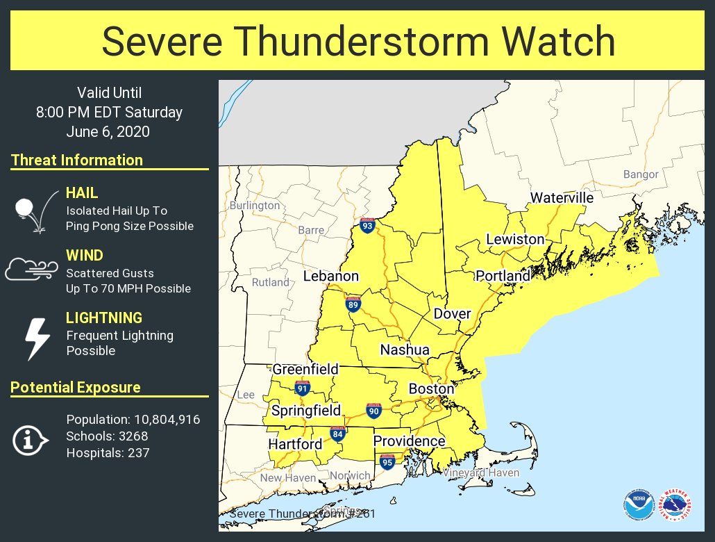 Good afternoon, A Severe Thunderstorm Watch has been issued for portions of southern New England. The Watch is in effect through 8 PM. Main threats are damaging wind gusts, large hail, frequent lightning and heavy rain. If you have any questions or would like more information, don't hesitate to contact us via this email address, on NWSChat <https://nwschat.weather.gov/>, or at the following: National Weather Service Boston/Norton, MA 46 Commerce Way Norton, MA 02766 508.622.3280 Website <http://www.weather.gov/boston> | Facebook <http://www.facebook.com/NWSBoston> | Twitter <http://www.twitter.com/NWSBoston>