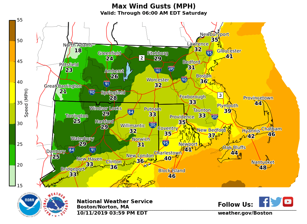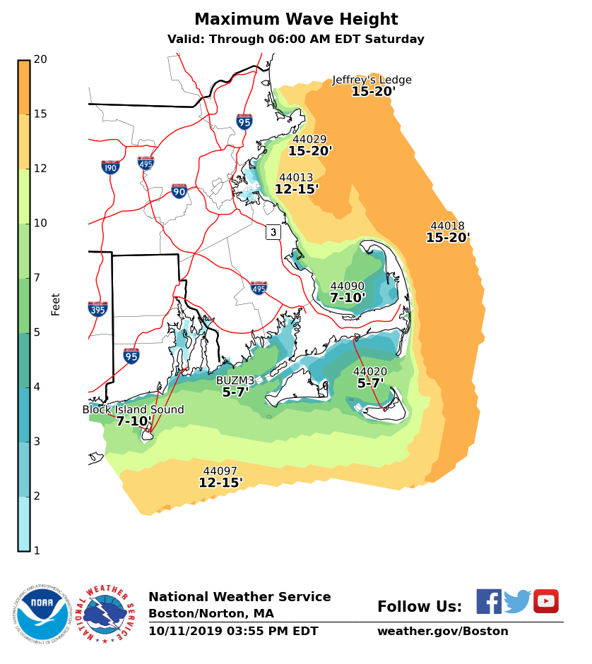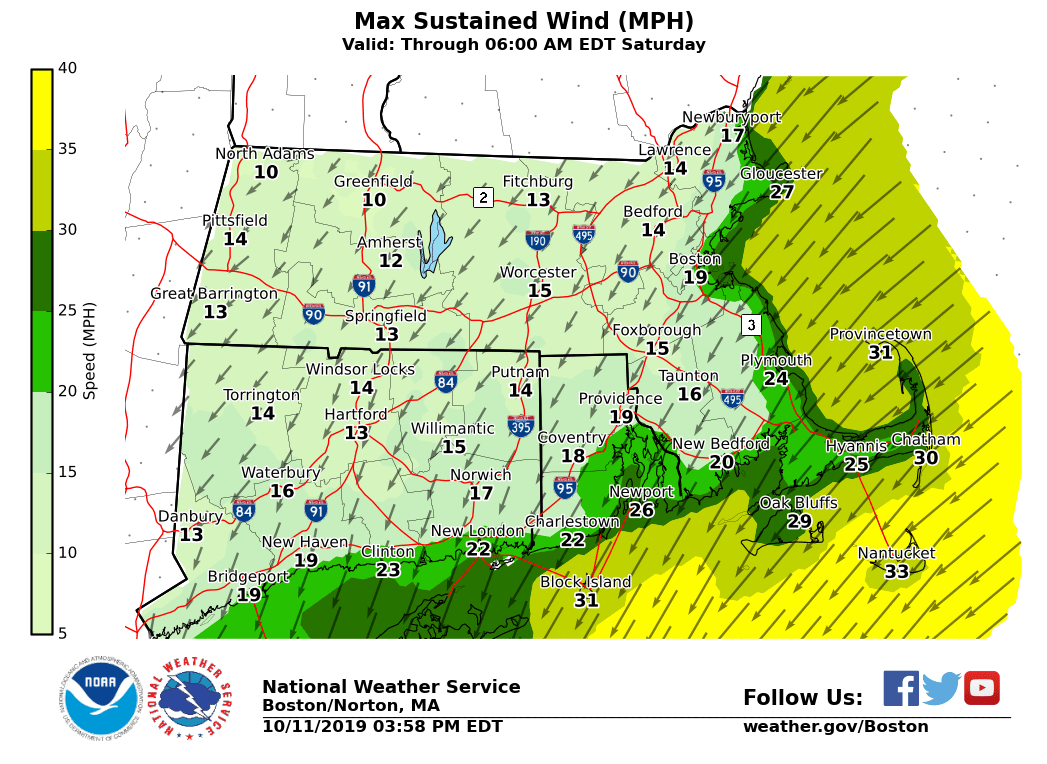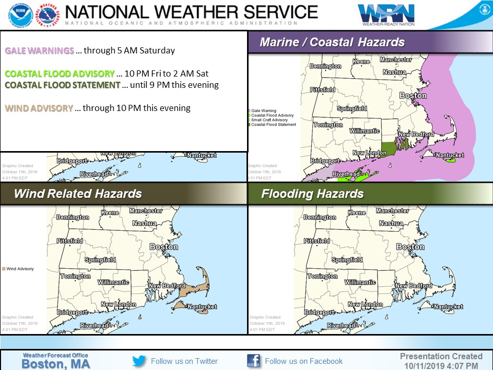 Good afternoon, A long-duration storm (Subtropical Storm Melissa) continues to bring wind, rain and minor coastal flooding to portions of southern New England into tonight. *What has changed ...* - A *WIND ADVISORY* extended for the Cape & Islands through 10 PM EDT. - A *COASTAL FLOOD ADVISORY* has been issued for Nantucket for the overnight high tide - A *COASTAL FLOOD STATEMENT *has been issued for the south coast of RI for splashover during the high tide this evening. - *GALE WARNINGS* continue till 5 AM EDT Saturday at the latest. *What / Where / When ... * *Strong to damaging winds (Cape & Islands)* - Especially along the immediate coastline for the areas referenced above - Max sustained around 25 to 35 mph, max gusts around 35 to 50 mph - Isolated tree damage, power outages - Strongest winds this evening, diminishing overnight *Minor coastal flooding (Nantucket)* - Around 1.5 to 2.0 foot surge with high tides + around 5 to 10 foot waves - Less than one-foot of inundation above ground level is possible in low-lying areas near shorelines and tidal waterways, more specifically, potential issues for Easy Street in Nantucket - For the high tide around midnight - Surge lowers into Saturday with diminishing wind and wave action - Beach erosion remains possible with persistent northeast winds and waves of 10 to 20 feet up to the entrances of inner bays and sounds *Gale force winds along with high seas (all waters)* - Dangerous sea conditions for all vessels - Strong winds and high seas continue this morning into this afternoon, diminishing overnight into Saturday - Max sustained winds around 25-35 kt, gusts around 35-50 kt; highest seas around 10-20 feet Matthew Belk If you have any questions or would like more information, don't hesitate to contact us via this email address, on NWSChat <https://nwschat.weather.gov/>, or at the following: National Weather Service Boston/Norton, MA 46 Commerce Way Norton, MA 02766 508.622.3280 Website <http://www.weather.gov/boston> | Facebook <http://www.facebook.com/NWSBoston> | Twitter <http://www.twitter.com/NWSBoston>