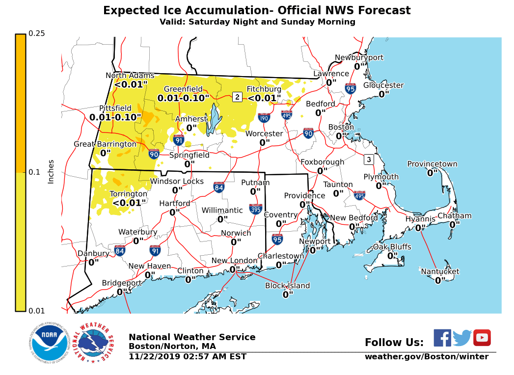 Good Morning, We are monitoring two weather systems through the weekend for possible hazardous weather: *This Afternoon and Tonight:* A strong cold front will cross the region this afternoon, followed by strong west winds this afternoon and tonight, which will mainly affect the marine community. *Marine Impacts: Gale Force Winds* *Locations*: Massachusetts and Rhode Island coastal waters *Timing:* Onset of Gales between 3 and 6 PM, ending between 3 and 6 AM Saturday, except by 11 AM farther offshore. *Wind Gusts:* W 35 to 40 knots, peaking between 8 PM and 2 AM. *Seas:* 4 to 7 feet on the inner bays and sounds; 10 to 15 ft offshore. *Impact:* Hazardous conditions for mariners. *Uncertainty:* Low. *Saturday Night and Sunday:* Low pressure is expected to track near Nantucket. As rain overspreads the region Saturday night, it will be cold enough for a wintry mix across parts of the interior with the potential for light icing and impacts to travel. Milder air will cause a change to rain Sunday morning. *Interior Light Icing (See Attached Image):* *Locations*: Western and north-central Massachusetts, possibly northwest Hartford County, CT, especially in the higher elevations. *Timing:* Wintry mix of snow and light freezing rain late Saturday night into early Sunday morning, changing to rain by late morning or early afternoon. *Impact*: Slippery travel. *Uncertainty:* Timing of the exact changeover. Higher confidence that snow and ice amounts will be light, with up to an inch of snow and a light coating (up to 1/10") of ice. *Minor Coastal Flooding: Sunday Morning High Tide* *Locations*: Eastern Massachusetts coast (including Martha's Vineyard and Nantucket) and the South Coast *Timing:* Sunday morning high tide (5:41 AM at Providence, 8:45 AM at Boston, and 9:46 AM on Nantucket) *Storm Surge:* 1.0 to 1.5 feet *Inundation:* Less than 1 foot above ground level *Impact*: Some vulnerable shoreline roads may become temporarily impassable around high tide. *Uncertainty:* High. Timing of highest surge may not coincide with high tide, which would lead to little or no impact. Minor coastal flooding would be the worst case scenario. *Minor Coastal Flooding: Sunday Evening High Tide* *Locations*: Eastern Massachusetts coast including Martha's Vineyard and Nantucket *Timing:* Sunday evening high tide (9:17 PM at Boston and 10:24 PM on Nantucket) *Storm Surge:* Around 2.0 feet *Inundation:* Up to 1 foot above ground level *Impact*: Some vulnerable shoreline roads may become temporarily impassable around high tide. *Uncertainty:* Lower than with the morning high tide. Locations along the Bay side of Cape Cod, Plymouth County, and Nantucket are most vulnerable. Updates will be sent as needed. If you have any questions or would like more information, don't hesitate to contact us via this email address, on NWSChat <https://nwschat.weather.gov/>, or at the following: National Weather Service Boston/Norton, MA 46 Commerce Way Norton, MA 02766 508.622.3280 Website <http://www.weather.gov/boston> | Facebook <http://www.facebook.com/NWSBoston> | Twitter <http://www.twitter.com/NWSBoston> Thanks, Joe DelliCarpini and Andrew Loconto