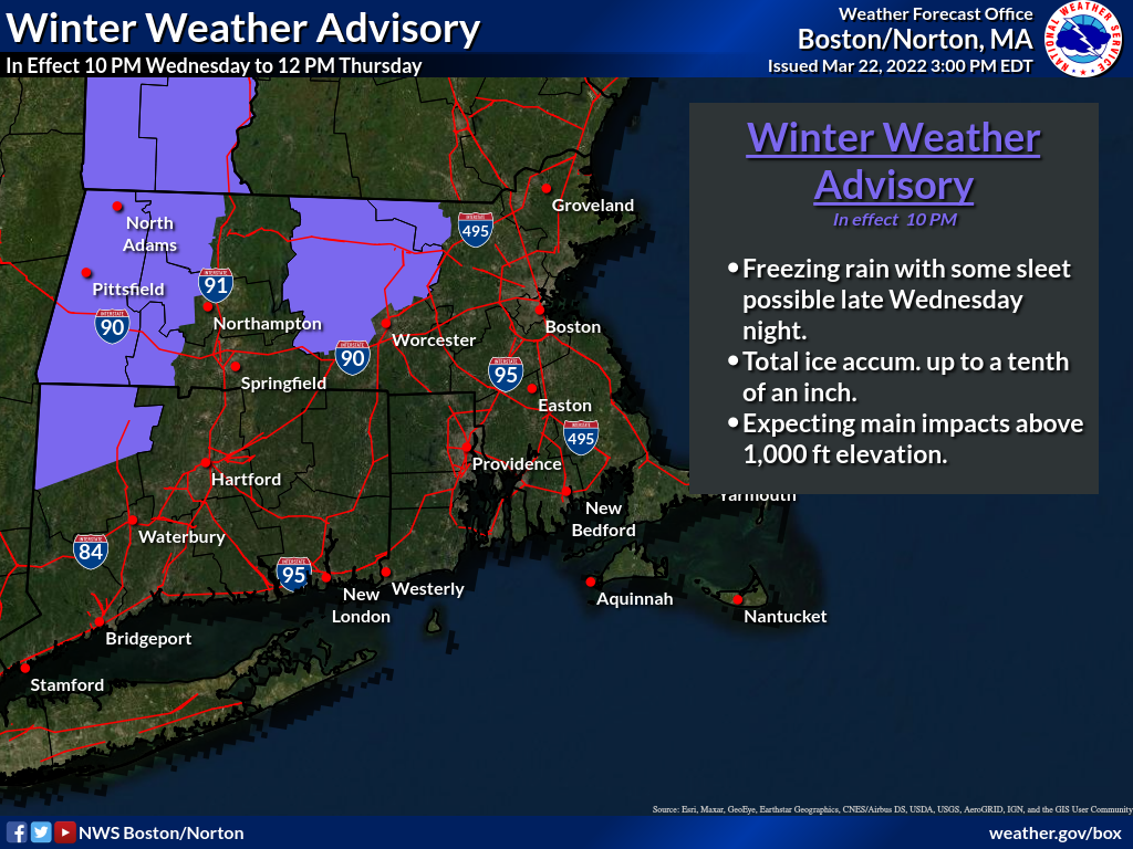 Good afternoon everyone. We are expecting some wintery precipitation late Wednesday night into Thursday morning. Freezing rain with a bit of sleet is possible with ice accumulation up to a tenth of an inch. Areas of concern are generally near and above 1,000 ft elevation. Winter Weather Advisory from 10 PM Wednesday to noon Thursday for higher terrain of the Berkshires, northern Worcester Hills, and Litchfield Hills. See attached image for advisory map. Plan on slippery road conditions. The hazardous conditions could impact the Thursday morning commute, mainly near and above 1,000 feet elevation. Next briefing by 6 AM Wednesday. - Meteorologist Torry Gaucher, Rodney Chai, and Hayden Frank If you have any questions or would like more information, don't hesitate to contact us via this email address, on NWSChat <https://nwschat.weather.gov/>, or at the following: National Weather Service Boston/Norton, MA 46 Commerce Way Norton, MA 02766 508.622.3280 Website <http://www.weather.gov/boston> | Facebook <http://www.facebook.com/NWSBoston> | Twitter <http://www.twitter.com/NWSBoston>