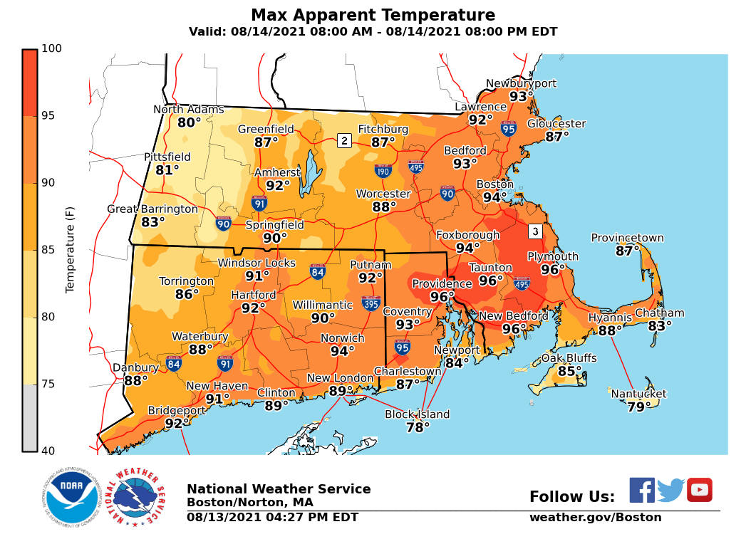 All, Just a short note to update you on tomorrow's (Saturday) forecast. Although it will be warm and humid, it does not appear to be enough for us to issue a heat advisory. Temperatures will top out in the mid to upper 80s, with Heat Index values generally in the upper 80s to lower 90s. Some locations, primarily northern RI and southeastern MA will see heat index values briefly reach the mid 90s. See attached forecast map of maximum heat index values. The thunderstorm risk for tomorrow at this time does not appear to be very large. If any stronger storms develop, we believe that would be across southeastern MA and RI. This will be our last email, unless noteworthy changes to the forecast are made overnight. Have a good weekend. Andy Nash If you have any questions or would like more information, don't hesitate to contact us via this email address, on NWSChat <https://nwschat.weather.gov/>, or at the following: National Weather Service Boston/Norton, MA 46 Commerce Way Norton, MA 02766 508.622.3280 Website <http://www.weather.gov/boston> | Facebook <http://www.facebook.com/NWSBoston> | Twitter <http://www.twitter.com/NWSBoston>