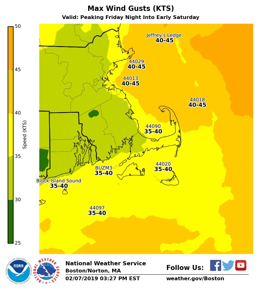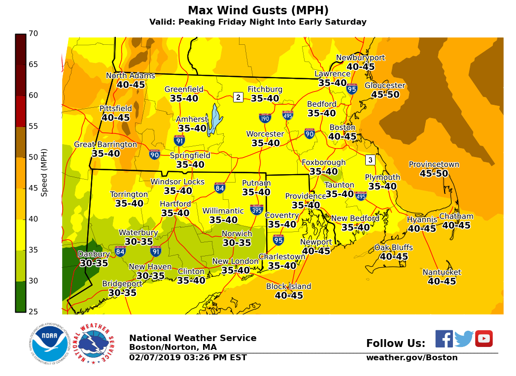 Good afternoon everyone, Strong winds are expected to increase Friday miring and linger into the afternoon on Saturday. With recent rains/wet soils, the prolonged period of strong winds may exacerbate the risk for impacts. *What:* - W-NW Sustained winds 20-30 mph. - Wind gusts up to 40-50 mph at times. *When:* - Winds Friday 15-20 mph with gusts to around 40 mph at times. - The strongest winds mentioned above mainly Friday night into early Saturday.. *Where:* - All of Southern New England will likely experience these winds. *Impacts:* - Winds of this magnitude may lead to downed trees/limbs. - Some scattered power outages possible. As always we will keep you updated. If you have any questions or concerns in the interim, don't hesitate to reach out via the information below. - NWS Boston/Norton If you have any questions or would like more information, don't hesitate to contact us via this email address, on NWSChat <https://nwschat.weather.gov/>, or at the following: National Weather Service Boston/Norton, MA 46 Commerce Way Norton, MA 02766 508.622.3280 Website <http://www.weather.gov/boston> | Facebook <http://www.facebook.com/NWSBoston> | Twitter <http://www.twitter.com/NWSBoston>