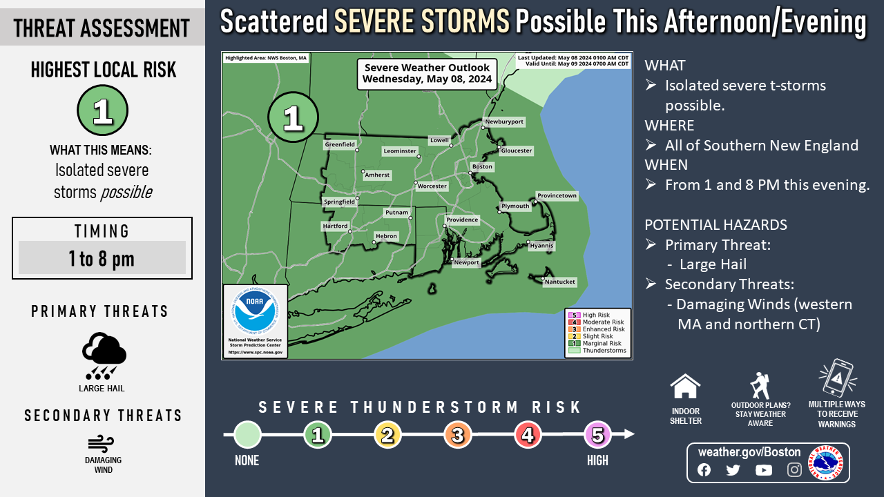 Good Morning, Isolated strong to severe thunderstorms are possible this afternoon/evening from 1 to 8pm. The primary threat is large hail, but damaging wind gusts are possible especially across western MA and northern CT. Attached is our latest severe weather risk graphic. Kyle Pederson and Kevin Cadima If you have any questions or would like more information, please don't hesitate to contact us. You can reach us via: email: box.operations@noaa.gov phone: 508.622.3280 Slack/NWSChat 2.0 <https://nwschatws.slack.com/> (for approved partners) social media: Website <http://www.weather.gov/boston> | Facebook <http://www.facebook.com/NWSBoston> | Twitter <http://www.twitter.com/NWSBoston>