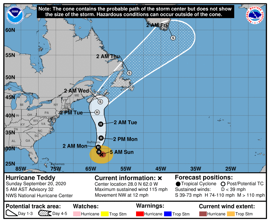 Good morning everyone Hurricane Teddy will pass approximately 400 miles east of the Massachusetts coastline on Tuesday. The main impact will be for our Marine community. We have high confidence in dangerously high seas of 12 and 18 feet developing across our eastern Massachusetts coastal waters along with northerly wind gusts of 35 to 45 knots. The worst of the conditions will be across the waters east of the outer-Cape and Nantucket. Pockets of minor coastal flooding & beach erosion appear likely during the Tuesday afternoon high tide cycle along the eastern MA coast and particularly across the north facing sides of Cape Cod and Nantucket. While some typically vulnerable shoreline roads may become flooded within a few hours of the high tide, significant coastal flooding is not expected. High surf & dangerous rip currents are expected on ocean exposed beaches. Northerly wind gusts of 40 to 50 mph are possible across Cape Cod and Nantucket Tuesday, which may require the issuance of a Wind Advisory. No rain is expected from Hurricane Teddy in southern New England. We have attached the expected track of Hurricane Teddy along with our current wave height and wind gust forecasts. Please let us know if you have any questions. Thank you! Meteorologist: Hayden Frank If you have any questions or would like more information, don't hesitate to contact us via this email address, on NWSChat <https://nwschat.weather.gov/>, or at the following: National Weather Service Boston/Norton, MA 46 Commerce Way Norton, MA 02766 508.622.3280 Website <http://www.weather.gov/boston> | Facebook <http://www.facebook.com/NWSBoston> | Twitter <http://www.twitter.com/NWSBoston>