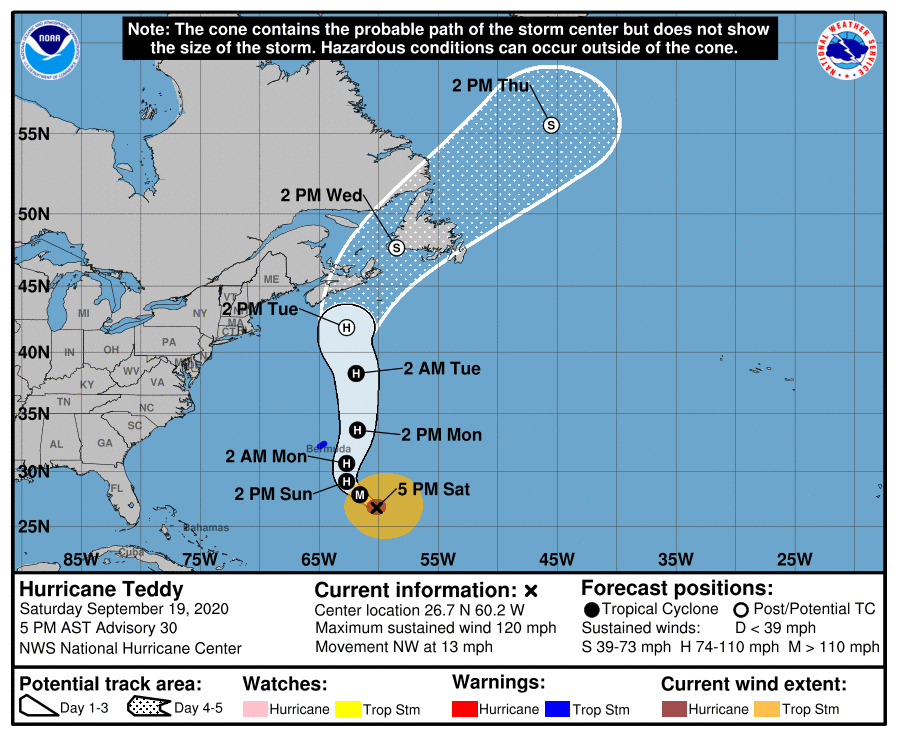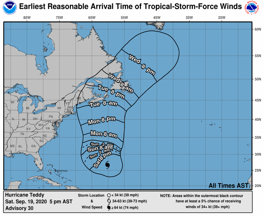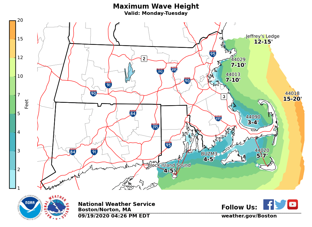 Good afternoon! There continues to be high confidence that Hurricane Teddy will pass well east of our region Monday and Tuesday. The main impact will be dangerously high seas for mariners across our eastern Massachusetts coastal waters, especially along Outer Cape Cod and Nantucket. Seas will build to between 12 and 17 feet with a period of North-northeast wind gusts of 30 to 40 knots. We have attached the expected track of Hurricane Teddy (issued at 5 PM), the earliest arrival time for tropical storm force winds, and our current wave height/wind gust forecasts. The only other impacts across our region will be persistent high surf/dangerous rip currents through Tuesday. There also will likely be pockets of minor coastal flooding/beach erosion along the eastern MA coastline during the afternoon high tide cycles through Tuesday. However, any coastal flooding should be minor and significant impacts are not expected. Please let us know if you have any questions. Thank you! If you have any questions or would like more information, don't hesitate to contact us via this email address, on NWSChat <https://nwschat.weather.gov/>, or at the following: National Weather Service Boston/Norton, MA 46 Commerce Way Norton, MA 02766 508.622.3280 Website <http://www.weather.gov/boston> | Facebook <http://www.facebook.com/NWSBoston> | Twitter <http://www.twitter.com/NWSBoston>