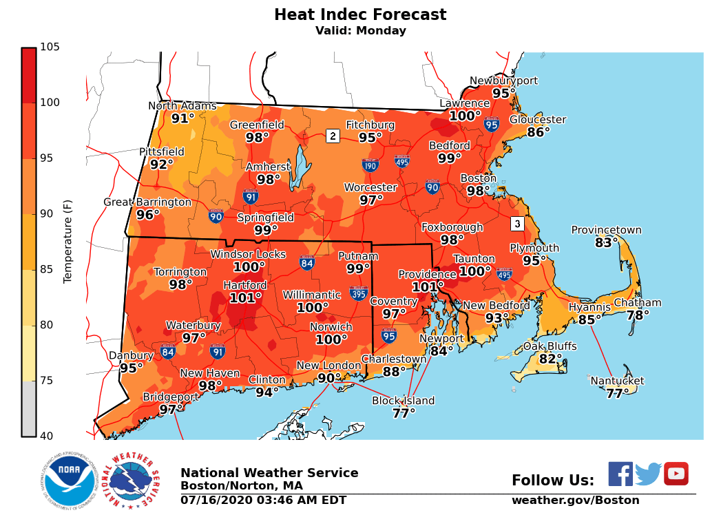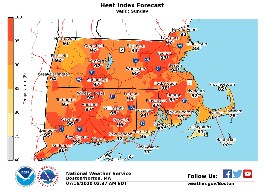 Good Morning Everyone, A prolonged period of heat and humidity is likely Saturday through Tuesday. The worst of the heat and humidity is expected on Sunday and Monday when heat advisories will likely be needed, especially in the Connecticut Valley and portions of eastern Massachusetts into Rhode Island. Heat indices will reach mid/upper 90s Sunday, peaking around 100 degrees Monday. Low temperatures overnight will be in the 70s. We have attached the latest Heat Index forecasts for Saturday through Tuesday. If you have any questions or would like more information, don't hesitate to contact us via this email address, on NWSChat <https://nwschat.weather.gov/>, or by phone at 508.622.3280. Thanks, Kevin Cadima If you have any questions or would like more information, don't hesitate to contact us via this email address, on NWSChat <https://nwschat.weather.gov/>, or at the following: National Weather Service Boston/Norton, MA 46 Commerce Way Norton, MA 02766 508.622.3280 Website <http://www.weather.gov/boston> | Facebook <http://www.facebook.com/NWSBoston> | Twitter <http://www.twitter.com/NWSBoston>