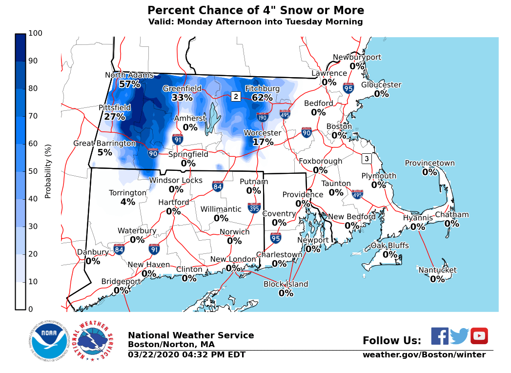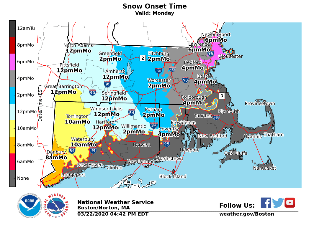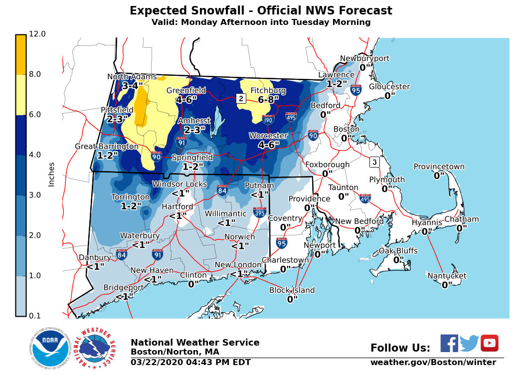 Good afternoon everyone, Here is the latest thinking about the coastal storm which will pass southeast of New England late Monday into Tuesday. It will bring snow to much of the area Monday afternoon before a change to rain Monday night. The key takeaway is that this is expected to be a minor snowfall event, with the exception of the higher elevations of western and central MA, where as much as 8 inches of snow is possible. Please see the attached graphics which include: - NWS Official Snowfall Forecast - NWS Official Winter Hazard Headlines - Approximate onset time of snow (Areas in dark gray receive mostly/all rain) - Chances of receiving 4 inches or more of snow *NEW:* - Winter Storm Warning for the Berkshires as well as the northern half of Worcester County - Winter Weather Advisory for eastern Franklin, Hampshire and Hampden counties; southern half of Worcester County (which includes Worcester) as well as northwestern Middlesex County *What's Changed: * - Lowered the amounts in eastern MA and RI along the I-95 corridor. Boston and Providence are not expected to receive accumulating snowfall. - Lowered the amounts across the northern half of CT. Most locations are expected to receive no more than a light accumulation outside of the hills. *What/Where/When:* - Snow develops from west to east across much of southern New England Monday afternoon, except near the South Coast, Cape Cod, and the Islands where mainly rain is expected. - Snow is expected to be heavy at times late Monday afternoon into evening, especially in the Berkshires and northern Worcester Hills. Heavy snowfall rates could lead to snow-packed roads and difficult travel. - Snow mixes with and changes over to rain from south to north. The higher elevations of northern Worcester County and the Berkshires are expected to remain mostly snow. *Forecast Amounts:* - 5-8" in the higher elevations of the Berkshires and in northern Worcester County. - 2-4" in western Middlesex, western Norfolk as well as eastern half of Franklin, Hampshire and Hampden counties. Parts of northern CT hills are expected to receive a similar amount. - Little to no accumulating snow is expected in east and along the I-95 corridor in MA and RI, including the Providence and Boston areas. Hartford and Springfield areas are expected to receive around 1". - The consistency of the snow will be heavy and wet. *Uncertainty:* - Snow amounts will be highly elevation-dependent, leading to potentially significant countywide differences in snow totals. - If the coastal storm passes farther offshore, snowfall totals will be less, especially across the interior. - Conversely, if the storm tracks closer to southern New England, there would be less snow across most of the region, since the higher accumulations would shift to the northwest of MA. For more details, check out our winter page: https://www.weather.gov/box/winter Expect another briefing no later than Mar 23, 6am EDT. Meteorologists: Rodney Chai, Andrew Loconto and Bill Leatham If you have any questions or would like more information, don't hesitate to contact us via this email address, on NWSChat <https://nwschat.weather.gov/>, or at the following: National Weather Service Boston/Norton, MA 46 Commerce Way Norton, MA 02766 508.622.3280 Website <http://www.weather.gov/boston> | Facebook <http://www.facebook.com/NWSBoston> | Twitter <http://www.twitter.com/NWSBoston>