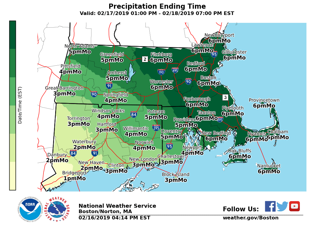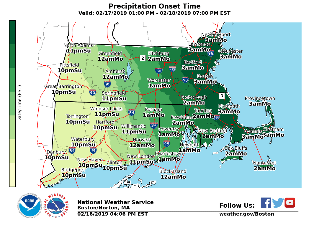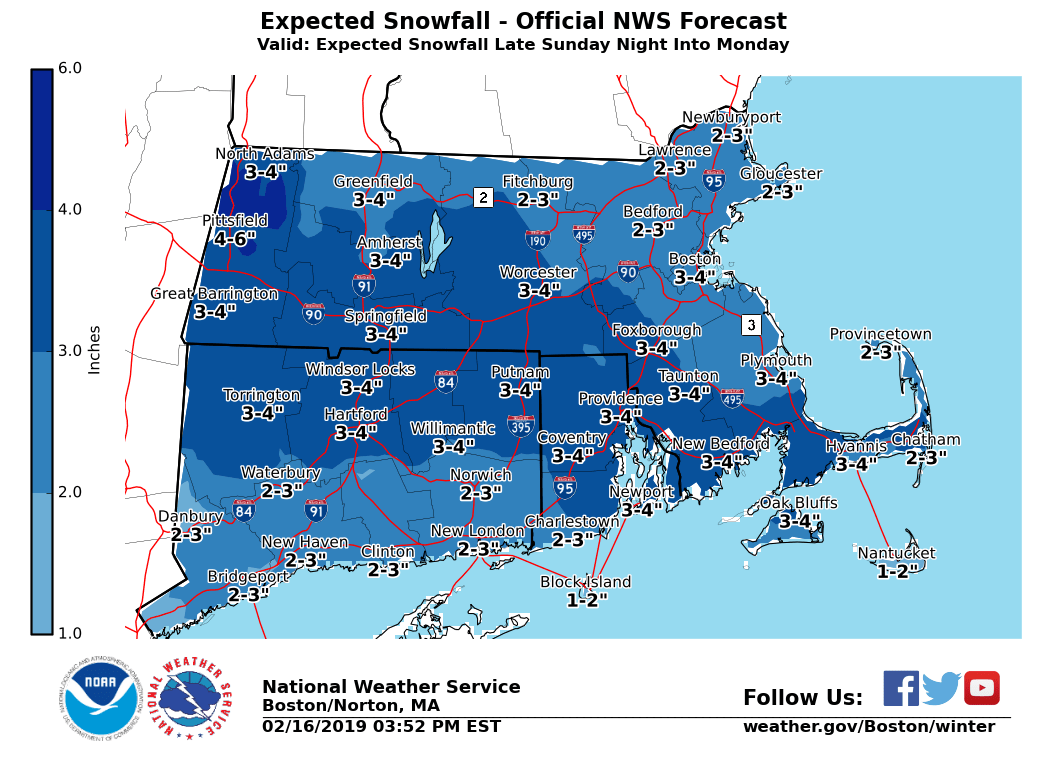 Good afternoon everyone. The threat for accumulating snow has increased late Sunday night into Monday, but uncertainty remains in specific amounts. We have included a brief outline in this email. Also, attached is our latest snowfall forecast as well as approximate start and end times. *WHAT: * - Accumulating snow expected. *WHERE: * - All of southern New England. *WHEN: * - Snow is expected to overspread the region from southwest to northeast between 9 pm and 3 am Monday morning. The highest risk for a couple inches of snow accumulation by daybreak Monday will be south of the MA turnpike and especially near the south coast. - The focus for accumulating snow will likely shift to central and eastern MA by Monday afternoon. Snow should wind down from west to east later Monday afternoon into early evening. *POTENTIAL IMPACTS:* - Roads may be snow covered/slippery along with reduced visibility for the Monday morning commute (although more limited given the Holiday). Highest risk will be south of the MA turnpike and especially near the south coast. - Greatest risk for snow and slippery roads during the Monday afternoon/early evening commute will be across central and eastern MA, where the ending time will be the latest. *UNCERTAINTY:* - Latest guidance suggests that 2 to 4 inches of snow appears reasonable for much of the region. These amounts may shift depending on the track of the low pressure system. - A track further south would limit accumulations to mainly an inch or two. If the low pressure system tracks further north, 3 to 7 inches of snow would be possible. Please let us know if you have any questions or concerns. Thank You Meteorologist: Hayden Frank If you have any questions or would like more information, don't hesitate to contact us via this email address, on NWSChat <https://nwschat.weather.gov/>, or at the following: National Weather Service Boston/Norton, MA 46 Commerce Way Norton, MA 02766 508.622.3280 Website <http://www.weather.gov/boston> | Facebook <http://www.facebook.com/NWSBoston> | Twitter <http://www.twitter.com/NWSBoston>