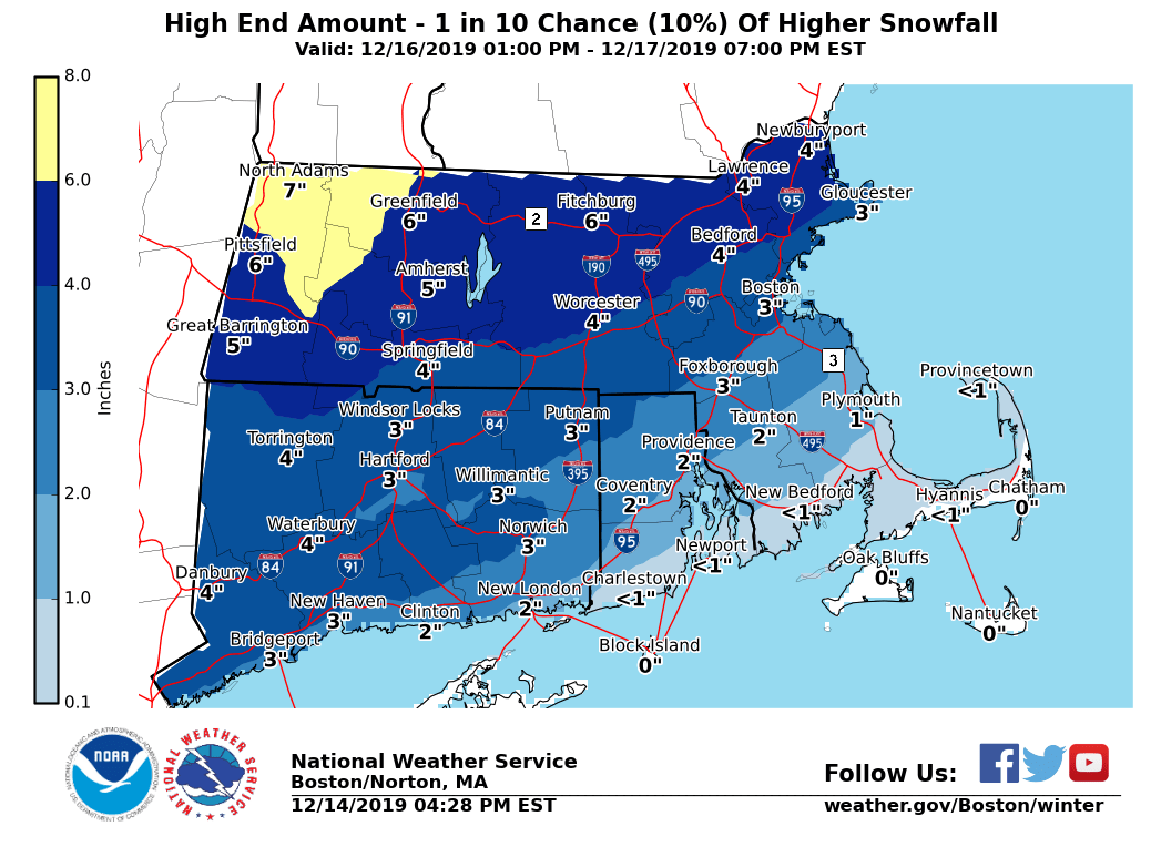 Good evening, Following is an update on river rises, strong winds and high seas through Sunday. However, we also want to provide a heads-up on another round of accumulating wintry weather for Monday night into Tuesday. *Changes with this update:* - *Wind Advisory issued:* Much of MA (except Bristol County) and Block Island. In Effect from 1 AM to 9 PM Sunday. - Updated snow and ice accumulations for Monday Night into Tuesday. *River Rises, Strong Winds and Rough Seas: Tonight through Sunday* *River Rises/Minor Flooding:* *Locations*: Mainly the Pawcatuck River at Westerly and Wood River Junction, Pawtucket River at Cranston, Wood River at Hope Valley, the Willimantic River at Coventry and the Taunton River at Bridgewater. *Timing*: Through Sunday afternoon. *Impact*: Rivers rising to near or over minor flood stage. Receding trends through Sunday afternoon. *Confidence*: Moderate to High. *Strong Winds:* *Locations*: Most of MA except Bristol County, and for Block Island in RI. *Timing*: Overnight into Sunday. Strongest winds Sunday late morning to afternoon. *Wind Speeds*: W to NW winds 20 to 30 mph with gusts 45-50 mph. *Impact*: Gusty winds could blow unsecured objects around. Tree limbs could be blown down and a few power outages may result. *Confidence*: High. *High Seas: * *Locations*: Coastal waters from Provincetown to Chatham to Nantucket and out 20 nm, Coastal waters 25nm south of Martha's Vineyard and Nantucket. *Timing*: Through 7 PM Sunday. *Wave Heights*: 10 to 15 feet. *Impact*: Hazardous seas combined with strong winds could capsize or damage vessels. *Confidence*: High Attached supporting graphics include the active Wind and Marine Headlines in effect, as well as the maximum wind gust forecast in MPH. *Accumulating Snow to Wintry Mix: Monday Night into Tuesday* We are also monitoring a period of wintry weather for Monday night into Tuesday. There is increased confidence that Monday overnight into the Tuesday AM commute will be impacted by snow and/or ice-covered roads with potential for travel difficulties. Initial snow to change to mixed precipitation across interior MA, northern CT into RI overnight into Tuesday. While most of the interior will stay wintry, a shorter period of snow and/or mixed precipitation is currently anticipated for E and SE MA into coastal RI, with an earlier transition to rain as temperatures warm above freezing sooner. *Confidence:* Moderate to high on wintry weather impacting the Tuesday AM commute, though only moderate confidence in snow and ice accumulations. Precipitation type changeovers and timing the changeovers remains uncertain and could alter snow and/or ice accumulations. Steadier bands of snow with snow rates at or over an inch per hour could result overnight into early Tuesday AM, though it is not clear where these bands may set up. Attached are supporting graphics for this event, with updated snow and ice accumulation forecasts. A reasonable worst-case snowfall accumulation is also attached, which may materialize if heavier snow bands were to transpire and/or if less mixed wintry precip is expected. Meteorologist: Andrew Loconto If you have any questions or would like more information, don't hesitate to contact us via this email address, on NWSChat <https://nwschat.weather.gov/>, or at the following: National Weather Service Boston/Norton, MA 46 Commerce Way Norton, MA 02766 508.622.3280 Website <http://www.weather.gov/boston> | Facebook <http://www.facebook.com/NWSBoston> | Twitter <http://www.twitter.com/NWSBoston>